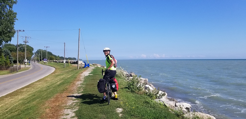 What a great first day of riding. Big storms rolled through at 3am and again at 6am so everything was wet when we started pedalling at 8:30. We planned to meet Jawz 17 miles in. He was there waiting when we rolled up. It took us about 10 miles to reach the coast, then it was cruising with Lake Erie off to our right. There were tons of beautiful lakefront homes. Jawz rode with us for about 6 miles till we reached a great breakfast spot. We spent quite a bit of time there just sharing stories.