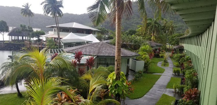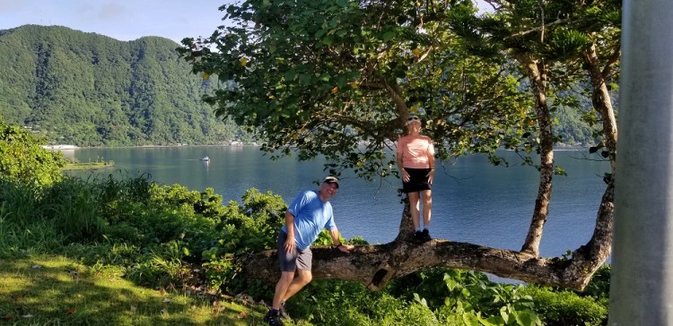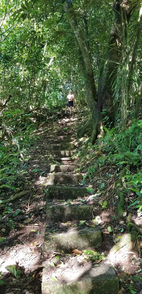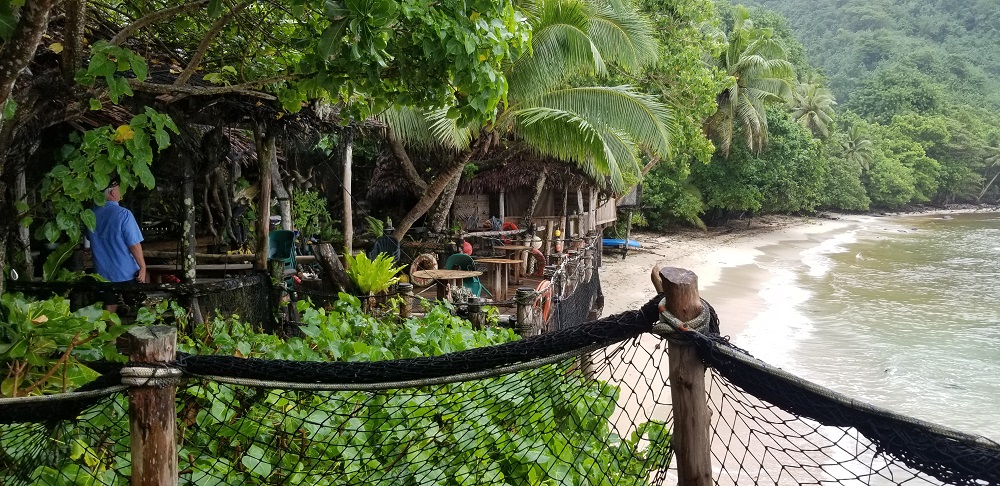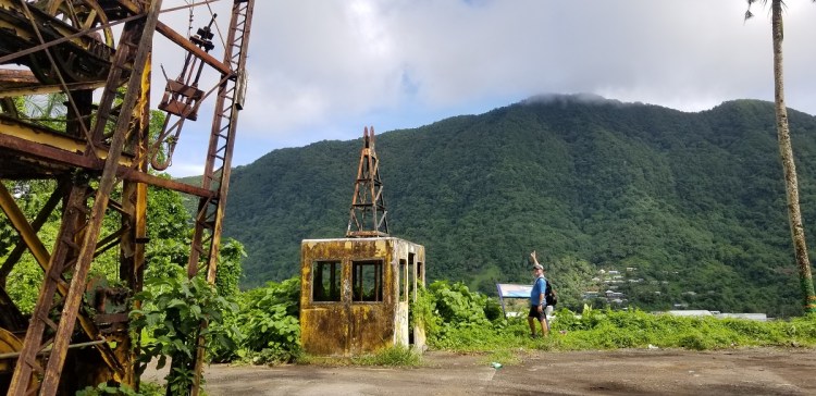 What a great day. The forecast was for more rain this morning but the rains had stopped and we saw the sun for the first time. We headed out to hike the ridgeline above our hotel overlooking the harbor. It was very interesting with several old military cannons that were put in place to protect the harbor from the Japanese. It was typical rainforest jungle, so very wet and slippery going. The 1.5 mile ridge includes lots of ups and downs. There were a few views, but the jungle has grown up since the military left years ago. Near the end was an old tramway station. The tram used to go over Rainmaker Mountain (1,716′) down to the village of Vatia. This saved a 10 mile drive up and over the mountains. Unfortunately, in 1980, a plane clipped the cables and crashed during a big festival. There has been some talk about rebuilding the tram, but there isn’t much tourism here to support the cost to build it.