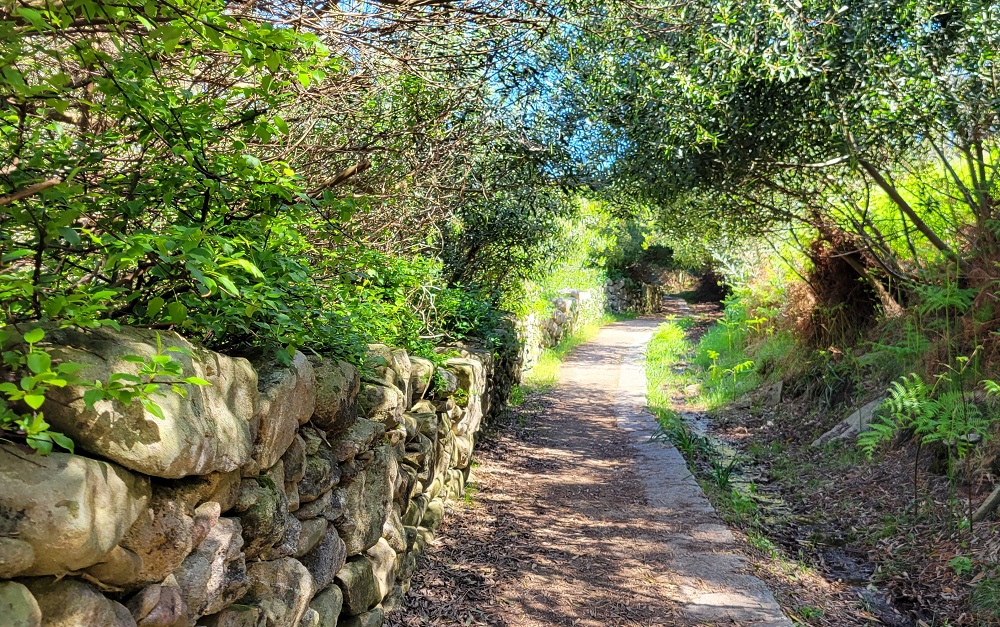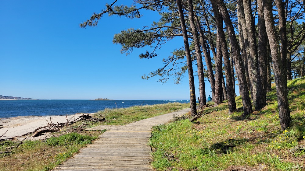 As you can see from the photos the scenery continues to be stunning. The first 6 miles were our last in Portugal. Today was another windy day, so glad I have a drawstring on my sun hat. No way you could wear a ball cap today. We passed a farmer who had his herd of goats with him. I didn’t see a building or farm anywhere around so not sure his story. He spoke only Portuguese, so we weren’t able to easily communicate and he wasn’t very interested, so no bother pushing it. After being right on the water most of the morning we had to cut inland to catch the ferry across the Minho River. This walk through the forest was also beautiful. The path we took wasn’t on the app and was against the arrow markings. Not sure why, because it sure was a nice walk. The marked route followed a dirt road. I knew I couldn’t get lost because you have the ocean on one side and the road on the other.