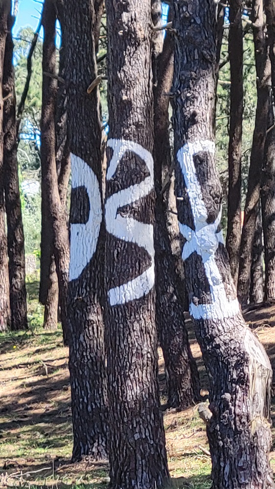 About ½ mile later was a beautiful hotel with a deck overlooking the water. There was 1 other person besides us four boat mates. We enjoyed a leisurely lunch and not a single other person came by. We watched several pilgrims walk on by as well. Soon after, there were all these trees that had interesting painting on them. It took a minute but figured out if you stood in the exact right spot three trees would make one pattern. As soon as you moved from that spot the pattern was all jumbled, very clever.