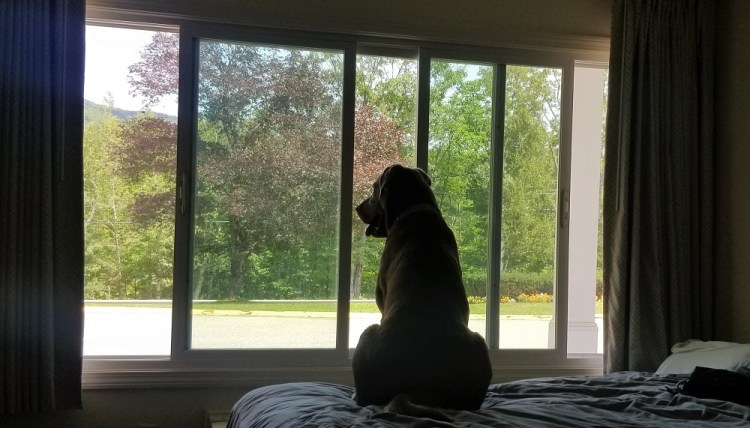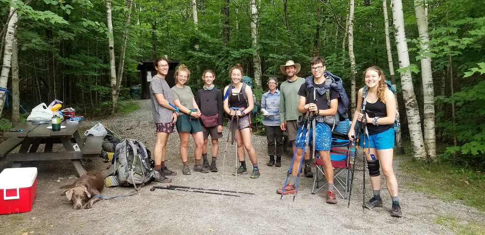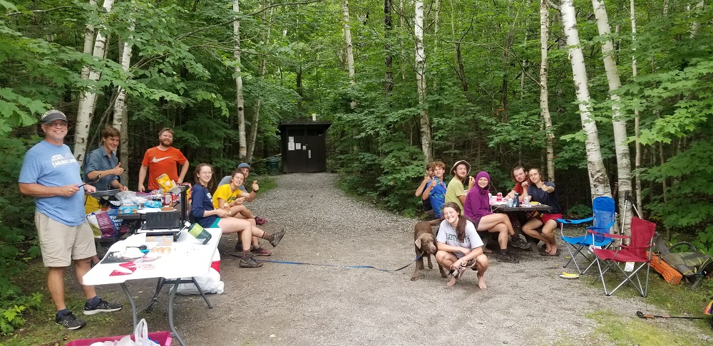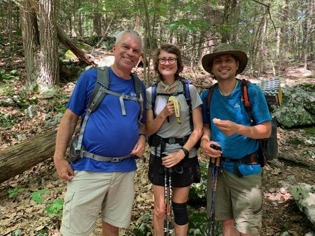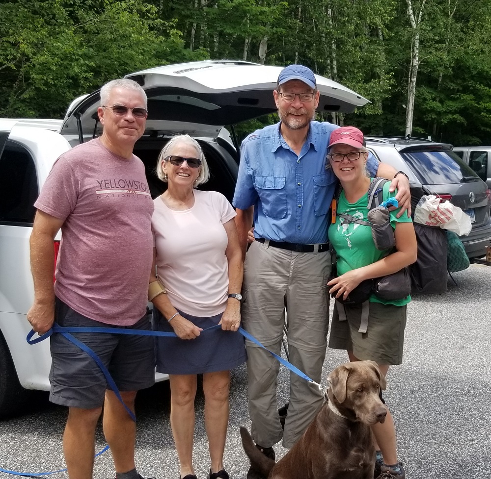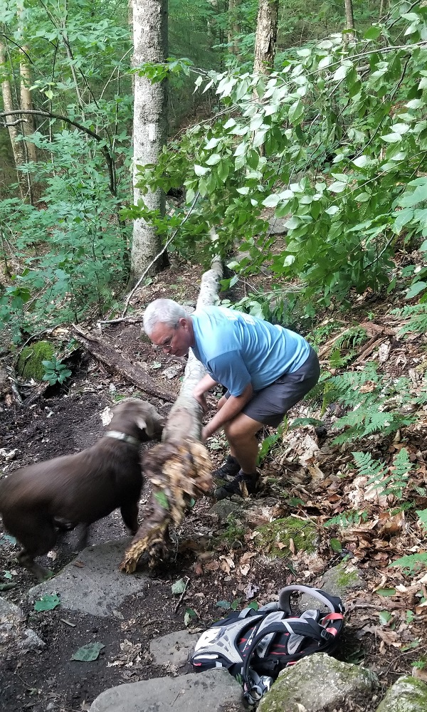 We only had three people that day but we mainly went to greet Grasshopper and Metta after their two day, 31 mile hike which included the AT’s most famous mile – Mahoosuc Notch. These 31 miles includes some of the toughest terrain the thru hikers face on their journey from Springer Mountain to Mount Katahdin. At about 5PM Gary drove 15 minutes south to get cell reception and an update on their progress. They still had a bit more than 3 miles to go. At 6 we walked south up the trail to greet them. Elizabeth stopped at a stream about a half mile in with some cold drinks for our tired friends. Gary and Rangeley continued the climb along the stream. Rangeley was off lead and enjoying the many waterfalls along the way. We also stopped and did some trail maintenance, removing two downed trees from the trail. At 7, about a mile in, Rangeley heard Metta’s voice and bolted up the trail to meet her and Grasshopper. We then all descended to the parking lot (meeting Elizabeth and the cold drinks on the way down) where we enjoyed a wonderful cookout before packing up and returning to our hotel.