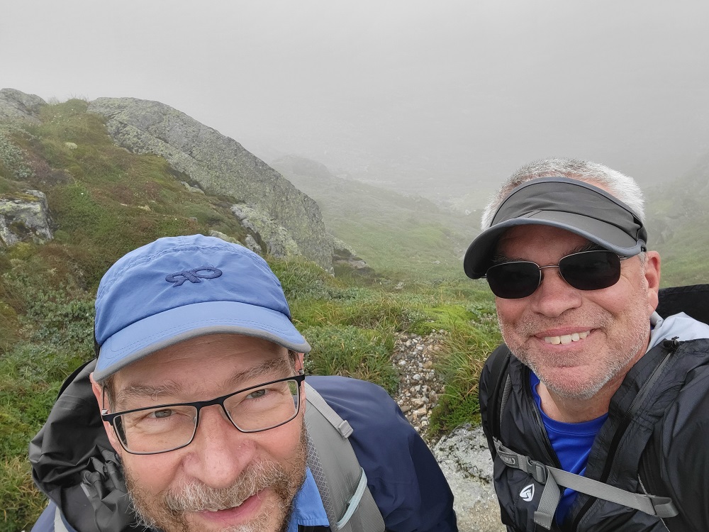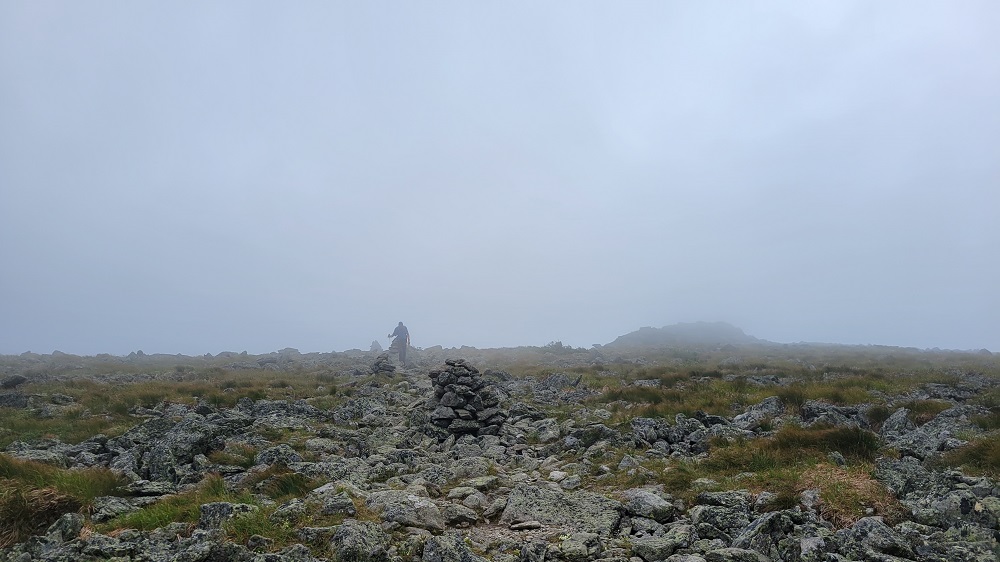 Gary writes: The ridge was in the clouds the entire time, except for about 15 minutes when we could look back and see the summit and the next round of the Cog climbing its way to the top. Most of the time we had no trouble seeing the cairns that mark the way along the ridge. At times, the clouds would get very thick and we would have trouble seeing the next cairn, even though it was only 50 feet away. Mt Washington is referred to as the “rock pile” and for good reason. It makes for a tough hike going from rock to rock. The ridge is all above tree line and offers spectacular views (when not in the clouds). This was my 4th or 5th time hiking across over the years. The first time in the 1980’s with Glenn, my older brother. There was some up and down, but the AT skirts the summits along the way. Even though we started at the highpoint of the northeastern US, and skirted the summits, we still climbed 1,500 vertical feet up so that meant we did almost 7,000 vertical feet of descent, most of that at the end on steep, slippery, rocky terrain. My legs were tired when we reached the parking lot. Now back to your regularly scheduled journal….