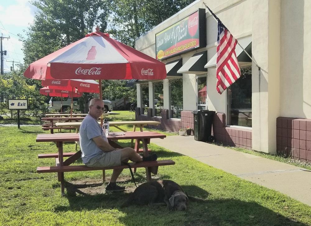 The Gorham House of Pizza is where we had our main meal today. It’s been closed the last two days and is open today. The picnic tables out front made for a great dog friendly spot to enjoy pizza and Greek salad.