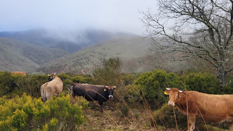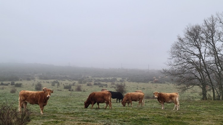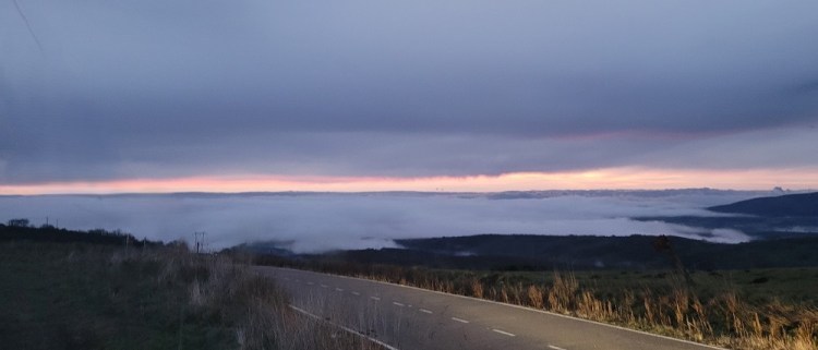 I had gone to the grocery store last night for breakfast and snacks. I bought ham, cheese and a roll to make a sandwich today. Turns out the first open café was 13.5 miles in. This morning started about 8:15 in the dark. I was at 4,600’, it was 36 degrees and it started pouring just after the cab dropped me off. I had rain pants, but was not wearing them. Bad choice. My pants were soaked by the time I got them on. I knew the forecast was for rain and snow most of the day up high. This is the highest stretch of the Camino. I climbed to 4,900’and then you go along a ridge for 4 – 5 miles before dropping down in elevation. The part of the forecast I missed was the high wind warning. It was tough regulating your body temp. When climbing you warm up. Then you get on the exposed ridge with the rain and wind it gets very cold. My umbrella was useless today.
