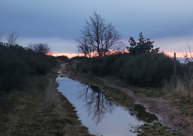 A couple miles later I had this feeling someone was behind me. I turned around and there is this 100+ pound dog in the trail, about 100’ behind me. We are over 3 miles from any village. He startled me. I spoke to him in a firm voice and he slowly wondered off, kind of circling me. Not sure what his story is. I had dropped my umbrella, but didn’t realize it right away. I got about ¼ mile down the path before realizing my error. Bummer, I hate adding ½ mile to an already long day in the rain and cold.