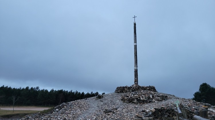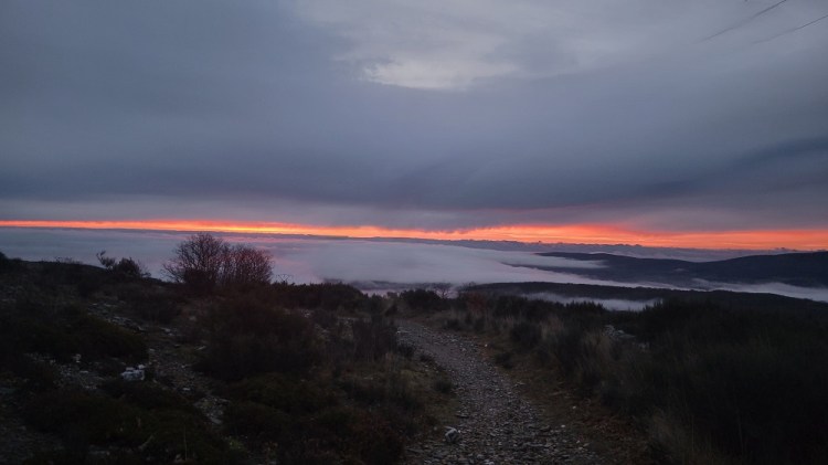 1.4 miles in is the cruz de ferro. I had a stone I carried from home to leave here for our friend in Phoenix. This is the 6th time in the past 10 years we have done this. Our friend had 2 cancers and was given 3 – 5 years to live in 2015. Now she plays tennis regularly and is in total remission. My friend from China was also there. He was hoping for a sunrise. No suck luck today. The sun did rise, but it was a cold, dark, gray morning. I started to cool off, so wanted to keep moving along the ridge.