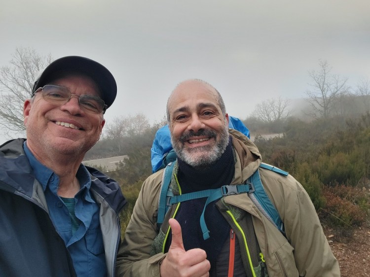 My first true stop was about 6 miles in when I came to a patch of trees and was able to get out of the wind. I had a drink and a snack but moved on quickly as I got cold right away. Soon after I dropped in elevation quickly. This made a huge difference as I got out of the clouds and wind and the temps were in the 40s. As I approached the first town I passed my 2 Korean young lady friends. They are a bit more “talkative” each time. I also passed the Barcelona couple. The husband wanted a selfie with me. He speaks no English, so it was fun. They are only out here for a week.