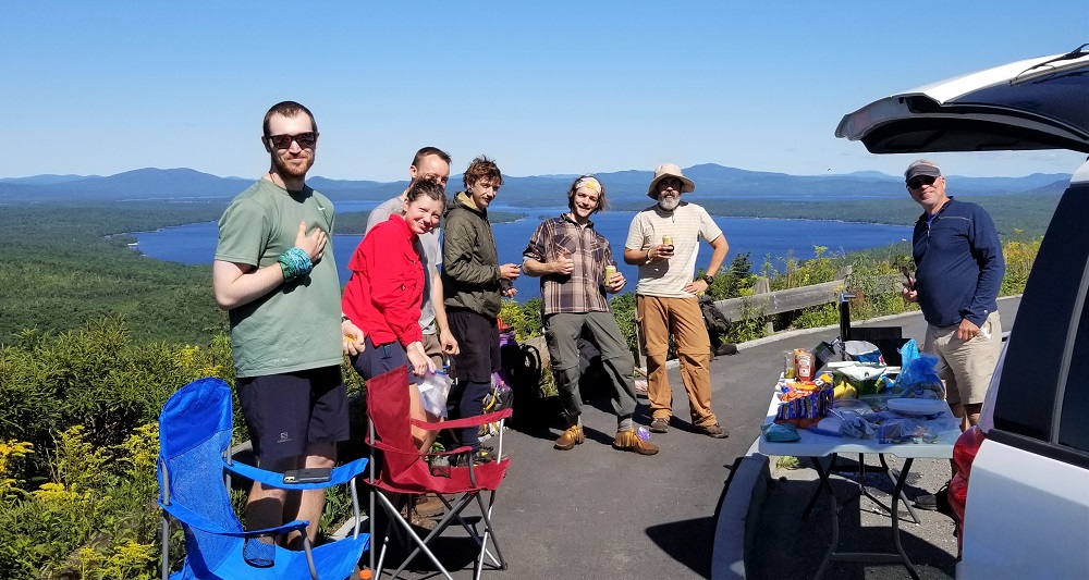 As you enter the Rangeley Lakes Region there is a parking lot where the AT hikers cross, about 9 miles before the town of Rangeley, population 1,000. We pulled in and parked, unloaded the car of water, Gatorades, cokes, beer, chips and cookies awaiting our hiking friends to appear out of the dense forest. If you didn’t read our first AT trail magic post under Roaming Rangeley, Gary (AZ) metGrasshopper and Metta during Gary’s section in June. We have been connecting with them as they finish their 2,193 mile thru hike to Mt Katahdin – the end of the trail for a northbound hike from Georgia to Maine.