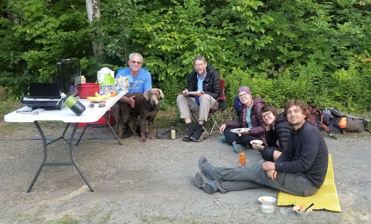 Midafternoon we piled back into the van and drove to the Stratton Trailhead about 30 minutes from the motel. Gary and Rangeley hiked south about .7 miles where they met the crew (Grasshopper, Sticks and Ranger) Gary left at the summit of Saddleback the day before and hiked back north to the parking lot with them. We set up the propane camp stove where Gary cooked hot dogs and chicken sausage, along with plenty of veggies, hummus, chips and dip, beer and soda. The typical dinner for long distance hikers who crave salt, meat and veggies. Gary joked that Sticks and Ranger are Rangeley’s favorite trail names – Ranger was a Park Ranger. Rangeley’s been to 42 parks in his short 15-month life and Sticks, Ranger’s wife’s trail name, is his favorite toy!