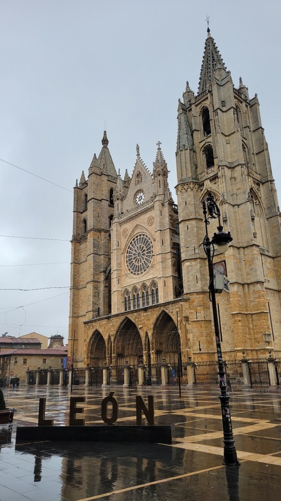 It actually warmed up through the night. This morning was 44 with a light rain. It was exactly the same 4 ½ hours later when I arrived in Leon. I used my umbrella for the third time this trip. I did not use it day 1 in the rain as I chose to use my poles hiking uphill through the woods. With flat terrain I carry my sticks and use the umbrella. Elizabeth has hers hands free, so she can do both poles and have the umbrella up. I have the hardware to do that, but just have not bothered.