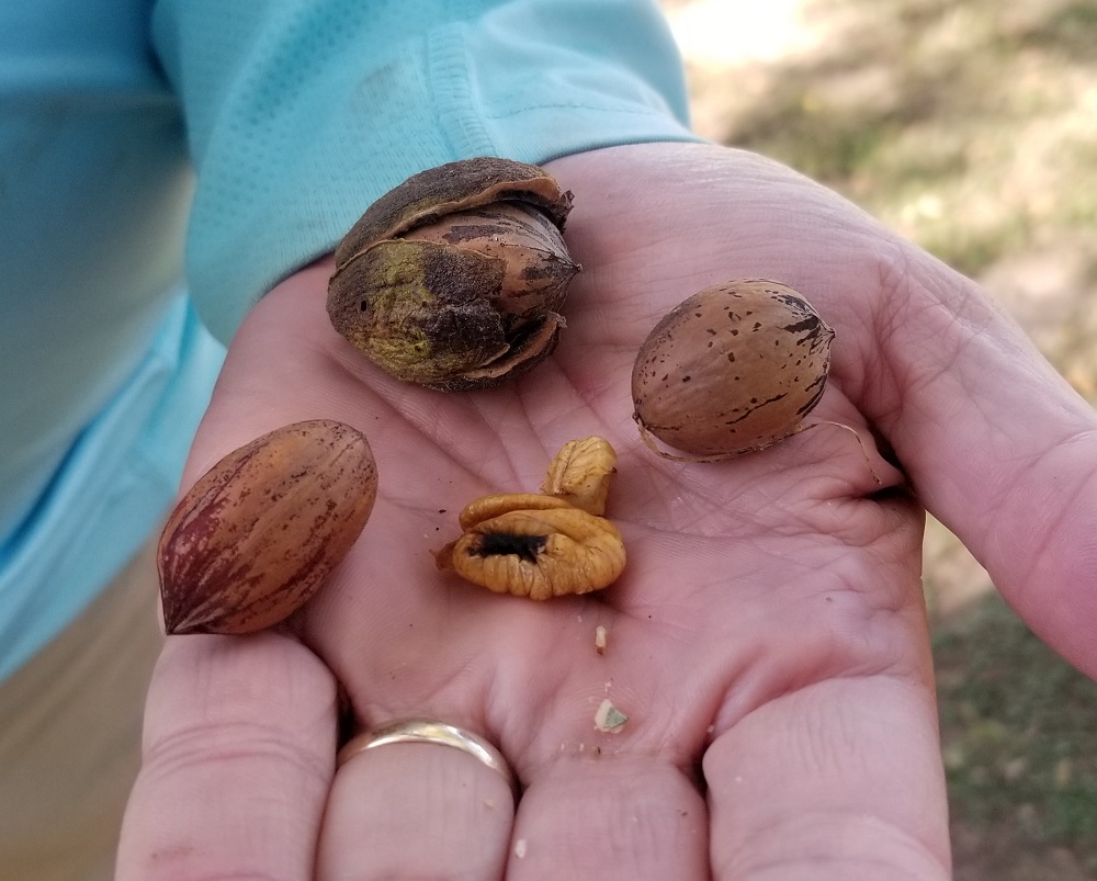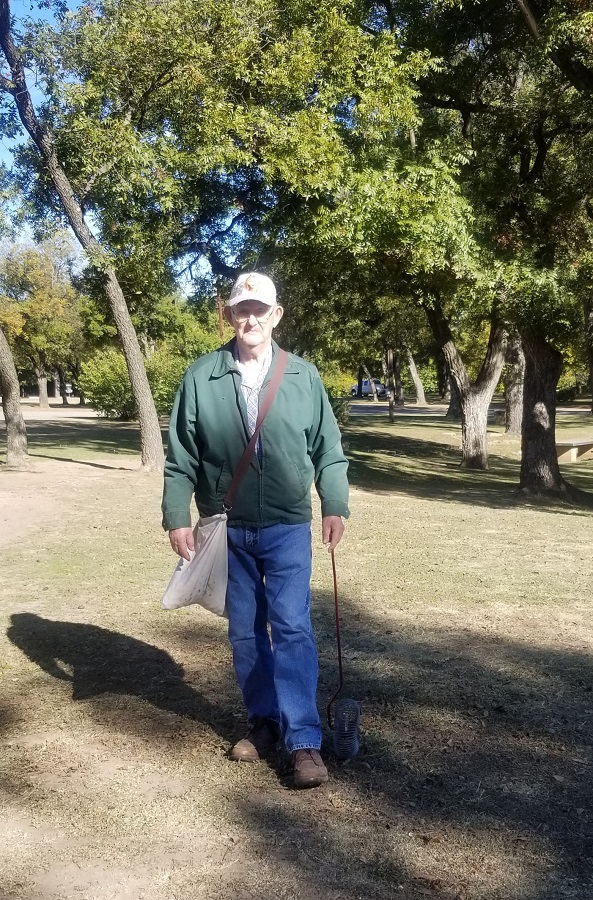 Our next destination, to stretch our legs, was preplanned after Gary researched it online. Colman City Park, in Coleman, TX looked like a great place to run Rangeley. We saw a man rolling a basket on the ground attached to the end of the pole. I asked him what he was doing. Ed, a sweet, local 80 yr. old had retired from the paper cutting business and was born, raised, and had married a local gal, here in TX. He said he was collecting pecans. He asked me to pick up two nuts, squeeze them together to crack one and eat the freshest pecans I had ever had, all while standing below the trees they just fell from! He also opened a couple for me and asked me if I had a container so he could give me some from his satchel full of nuts slung over his shoulder. I thanked him and told him I had just bought some 20 minutes ago. I asked him if he collects them for himself and he told me he gets 50 cents a pound, exercise and enjoys the sunny days in the park. As I looked up, I realized the entire park was full of pecan trees! See pics. What a wonderful conversation with a lovely man. We so enjoy the locals at each of our stops along our travels. Rangeley ate a few nuts he found, shells and all, but they are not good for dogs so we won’t share our purchased ones with him! Not to mention I paid $16 for a pound and a quarter, making it sad that Ed only gets 50 cents a pound!