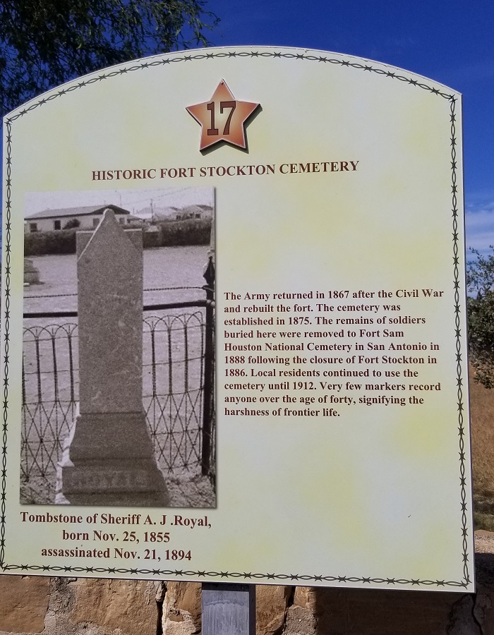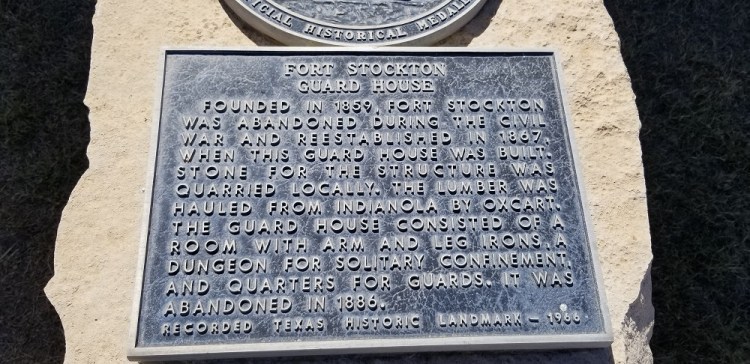 We then stumbled upon a small scenic driving tour (set up by the city?) experiencing some late 1800’s history in this town. After the Civil War, some troops returned to Fort Stockton and we visited some of the buildings that were occupied in the late 1860’s. See plaques and more info are in the slide show attached. One of the pictures is a historical marker re: The Fort Stockton Guard House. It had a dungeon for the prisoners. A 40-yr.-old local man waited for us to return from the informational walking tour and told us he spent many weekends here with his cousins growing up. They would sneak into the Fort’s buildings and play in the dungeon. He had his 11 yr.-old-son with him and was proud to show him the Fort’s and this town’s history and made a point to share what he knew with us. Again, a fabulous example of meeting the wonderful local people in small town USA.