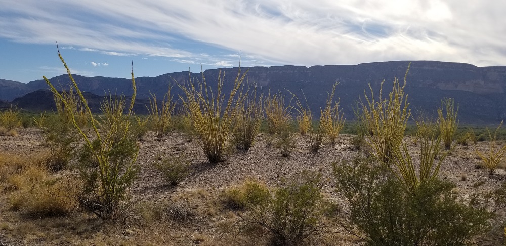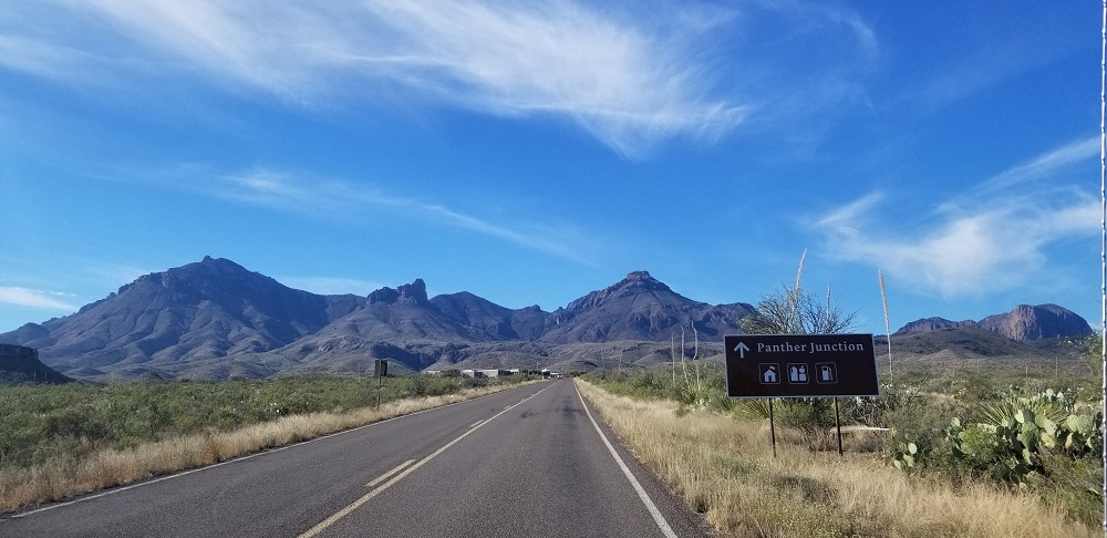 Big Bend is on the Texas/Mexican border. It was a total of 135 mi. From Ft Stockton to the Panther Junction Visitor Center inside Big Bend National Park. Once Marathon was in our rearview mirror we could now see beautiful rock formations, the Chisos Mountain range, Prickly Pear cactus, Ocotillos, creosote bushes and yucca plants. It was as though we were back in AZ.
