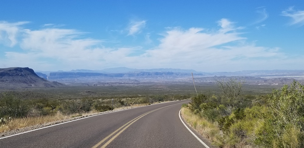 Immediately after the left turn out of Fort Stockton’s west end it turned into, literally, thousands of barren acres. Flat mostly, a few rolling hills, for 59 miles into Marathon, TX. There was not a single cross road. We saw only three cars coming towards us and zero vehicles behind or in front of us. We took our first turn in 59 miles coming into Marathon, TX. We headed south to Big Bend National Park.