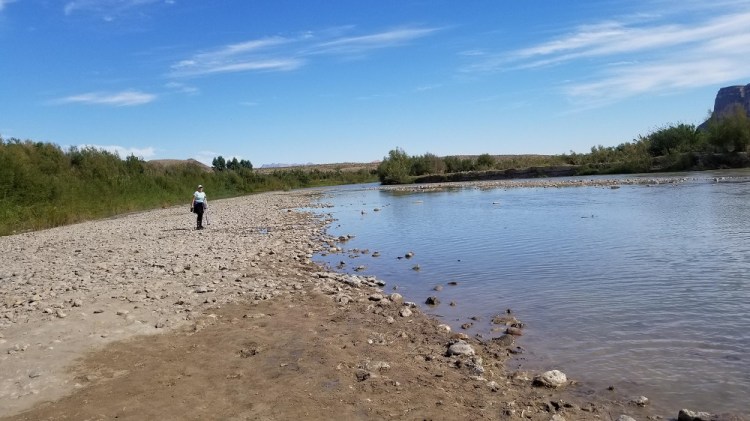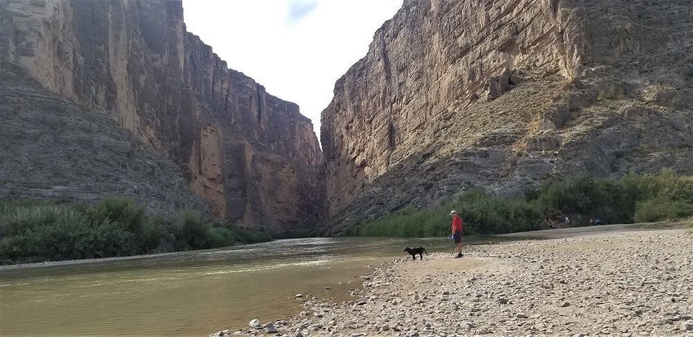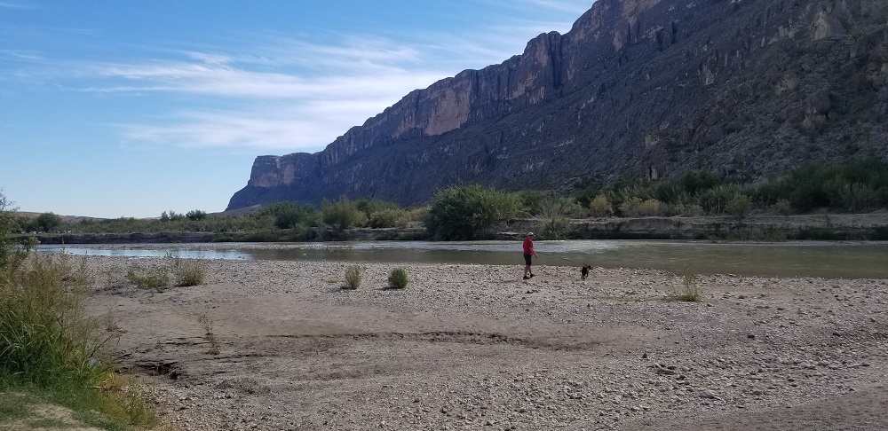 Next stop in this vast wilderness park was Santa Elena Canyon Trailhead heading west yet again. The Rio Grande was 1/10 mi from the parking lot so Gary took Rangeley, and me on my crutches for stability on my now healing ankle, up the slightly uneven path to a very rocky beach and played by the river. The 1000 to 1,500 foot walls of the sandstone cliffs were impressive. We watched people wade, thigh deep, to get to the trail that you can take to a lookout. Enjoy the pics in slide show attached. Standing on the banks at this location, we could see livestock just on the other side in Mexico. The Rio Grande River is the border between MX and TX and in the eastern part of the park there is a row boat you can take to the Mexican side to have lunch in a town a mile from the river. The adventure sounded fabulous to Gary and I and we were sad to know that the dog and my ankle would preclude us from partaking…until…we heard that the self-guided, rustic and fun excursion was cancelled due to COVID. Maybe a Tequila brunch next time!