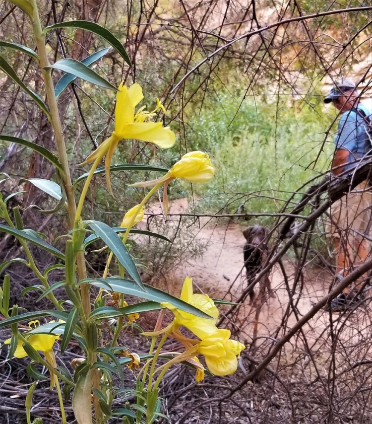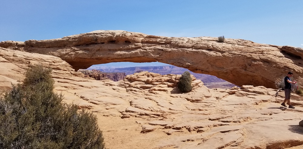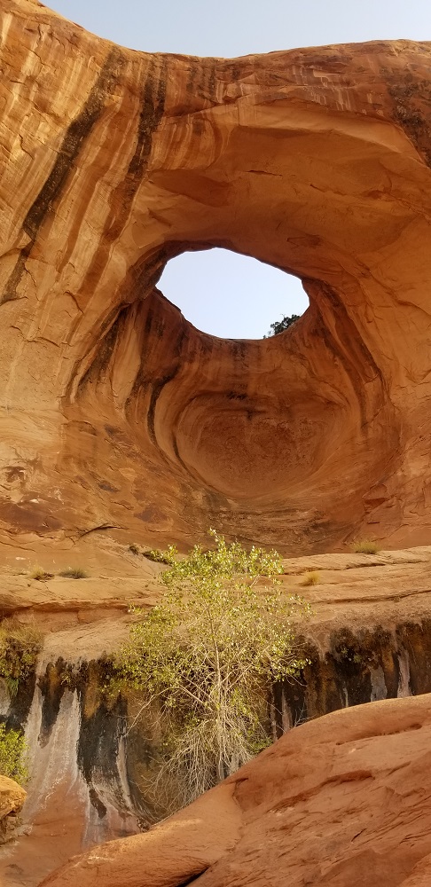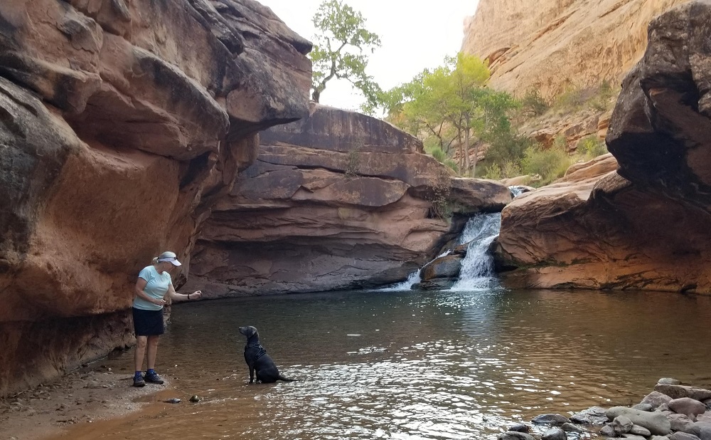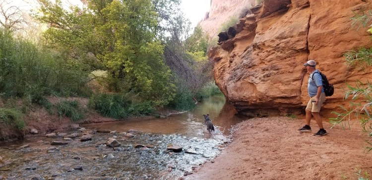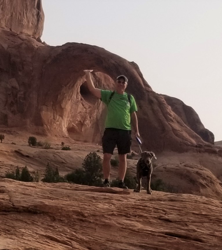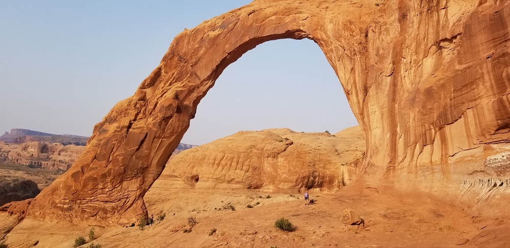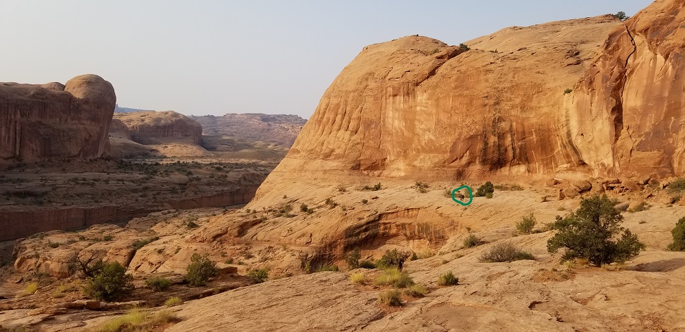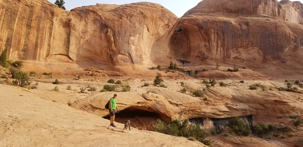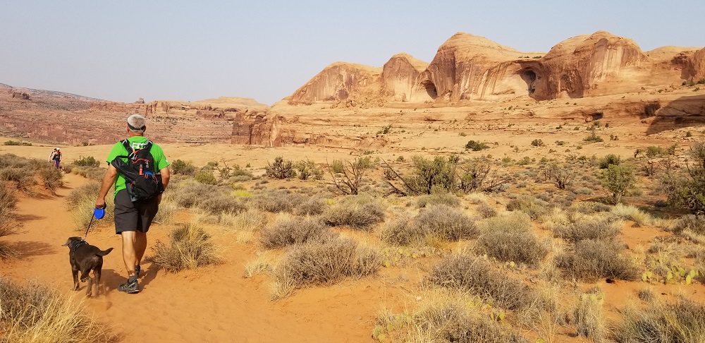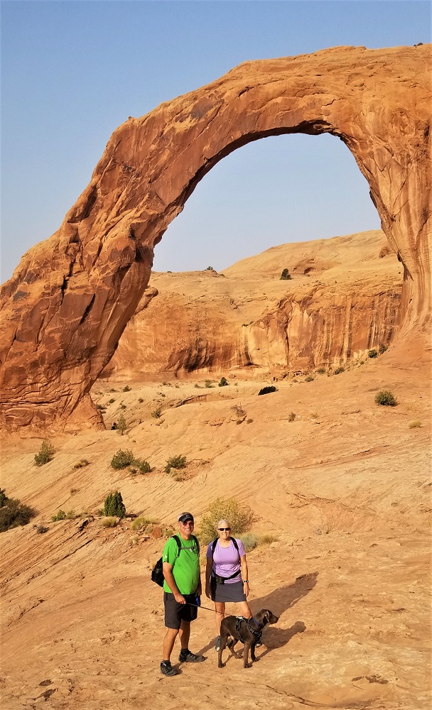 Corona Arch is made of Navajo sandstone with an opening of 140’ across and 105’ tall! We took many wonderful pictures, some of which we added to this journal. We began our hike at 8:15AM (sunrise is after 7AM right now) The people we met were from all over the US… retired, Millennials, dogs and kids. The photo of us together, with Rangeley, under the arch was taken by a guy roughly in his 50’s who told us he repelled from the top of the arch about 5 years ago! If you zoom in to the center and top of the arch, you might see striations made from the many ropes over the years. Due to popularity and some serious injuries and a death, you can no longer climb on the arch.