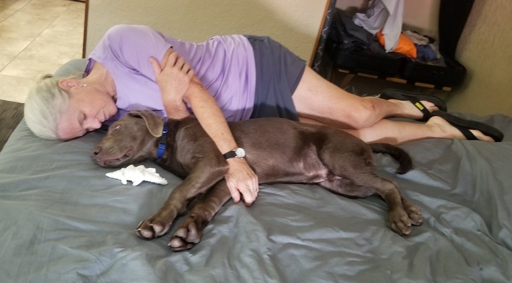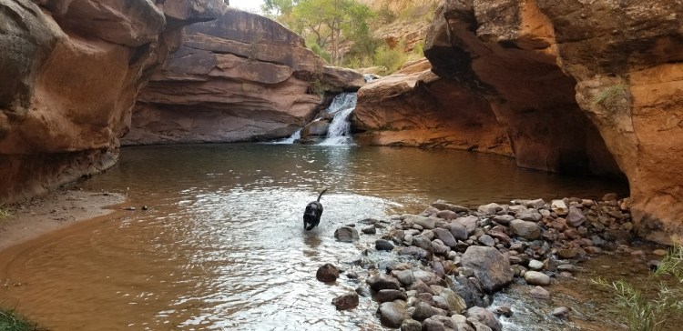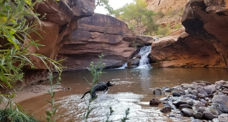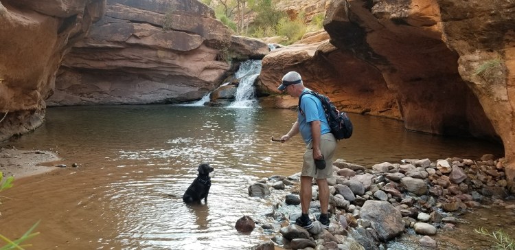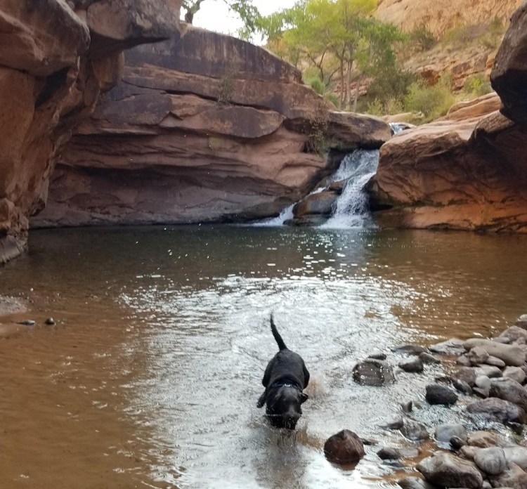 This morning we did a hike that we all loved! Mills Creek Trail starts just south of town. It followed along a stream, through trees, ending up at a 30 feet water fall into a 6-7’ deep pool currently. Rangeley was in his element swimming in the “pool” and jumping in and out of the stream anytime he could! See pictures. (If you are ever taking this trail, take note that when you come to the small mill & dam you’ll see a sign stating no mountain bikes past this point…go past/behind the sign and follow the stream. There was a bit of a fork there that was slightly confusing.) There’s a short traverse over a rock ledge along the stream and then flattens out. You can walk through the stream instead if you wanted to. We crossed the stream three or four times at ankle high water arriving at the falls just about one-mile into the out and back trail. Gary said he didn’t know who was having a better time, Rangeley or me!