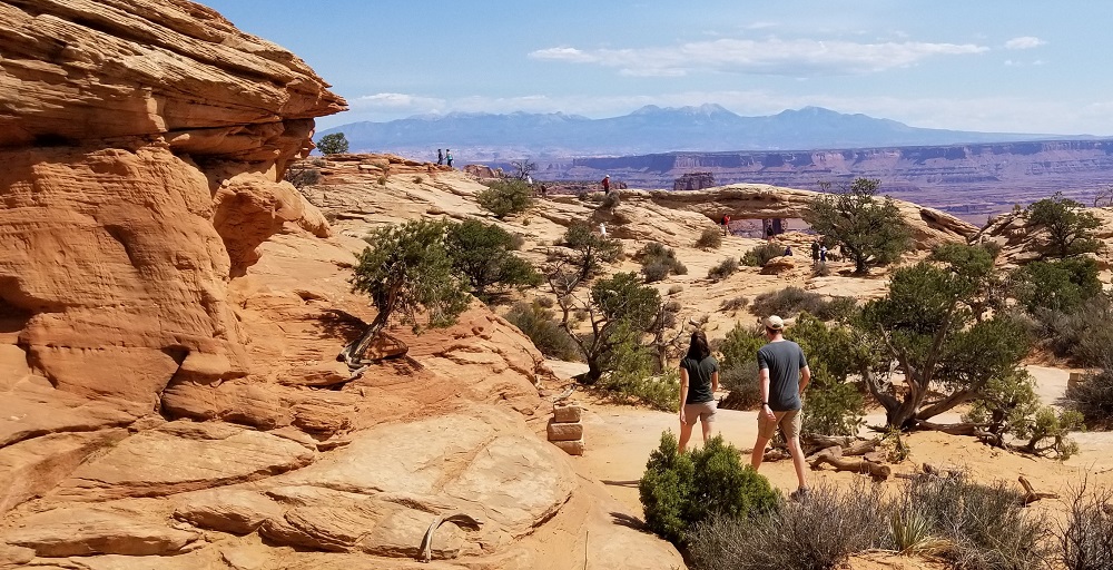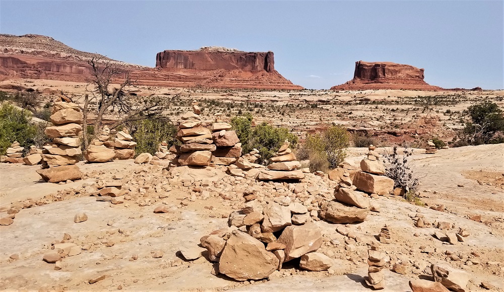 After a short regroup at the hotel we headed to Canyonlands NP, about 30 miles away. The first stop was, of course, our picture at the NP sign which we always post at the top of our journals. Then to the visitor center to get a commemorative pin, post card, maps of the park and any trail and sites directions as well as clarifications on the dog rules. Not a very dog friendly park : ( This park store was totally open…no window shopping or pointing to what you want from single examples and paying through a portal. The store did have a designated entrance and exit to encourage a one-way flow and of course mask wearing was mandatory but the whole store was open.