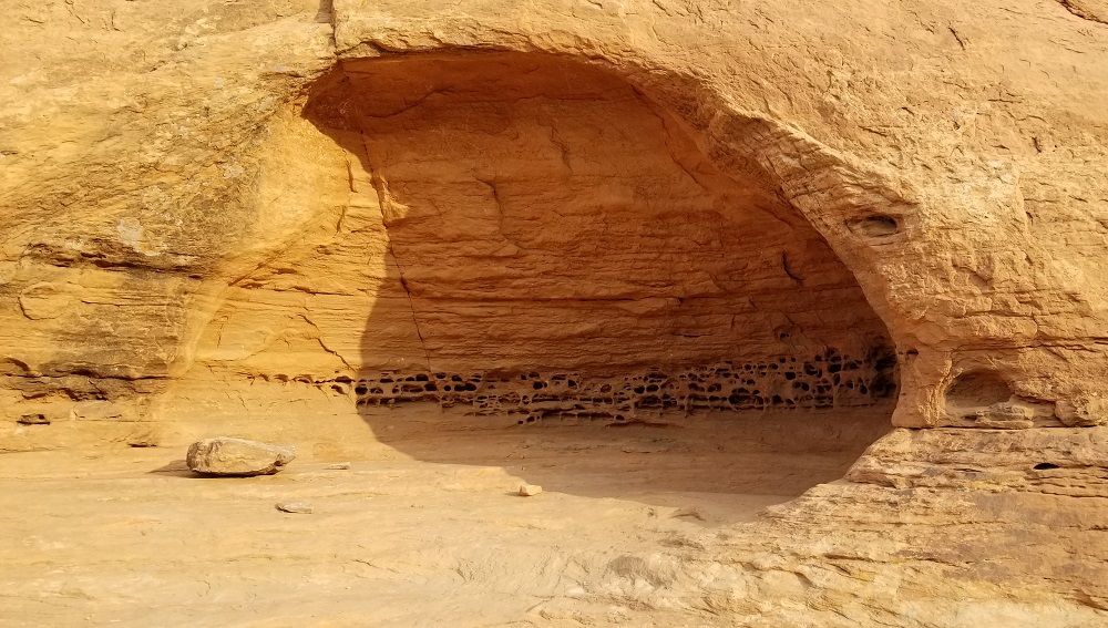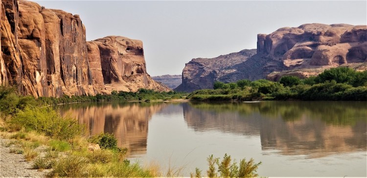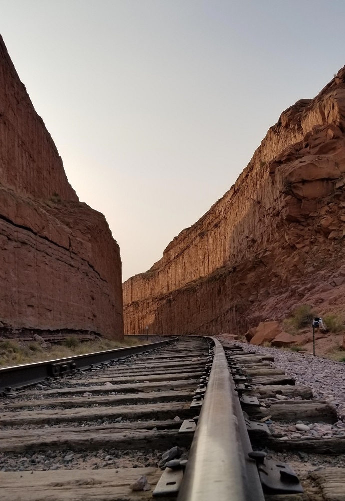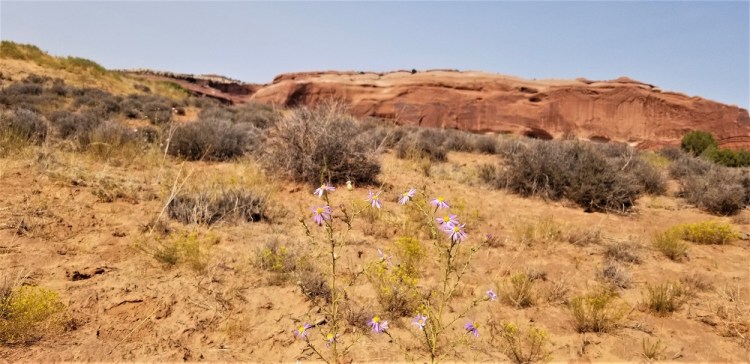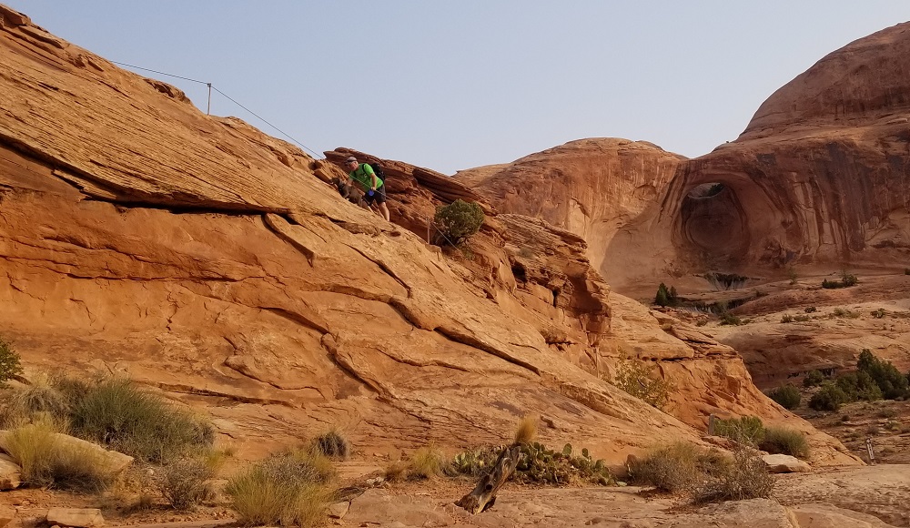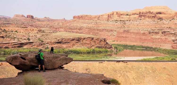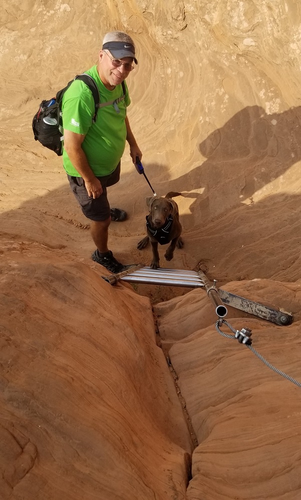 We took a fabulous walk to Corona Arch. The drive is 12 miles outside Moab with the Colorado River on one side and sheer cliffs raising on the other. There were climbing tour groups ascending right at road’s edge and rustic camp grounds for just a few tenters at each turn off. The trail crosses a railroad track and heads up a total of roughly 400+ vertical feet over the 1.5-mile, one way, out and back walk. We walked on dirt, red sandstone sand and very large boulders. At one point there was a short steep, cable strung and foot holds in the rocks climb which, with harness handle in hand, Gary and Rangeley did flawlessly! Then came a 5-rung ladder… which Rangeley and Gary were able to circumvent… and there were views that encourage you to sit and contemplate.