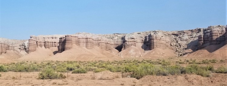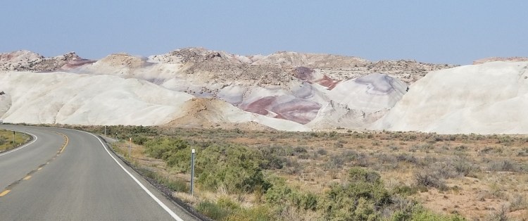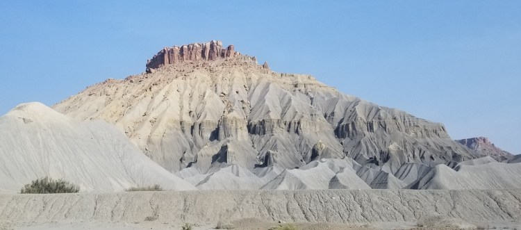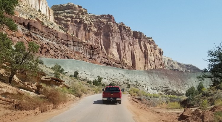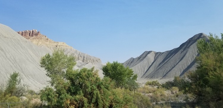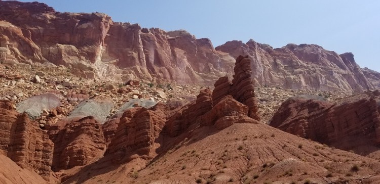 Ok, back to the regularly scheduled journal! Driving between Hanksville and Torrey UT there is a kaleidoscope of colored rocks, a geologist’s play yard! The layers are in blue, red, black, white, beige, grey, brown and green. The Dirty Devil and Fremont Rivers run through this area. See pictures.