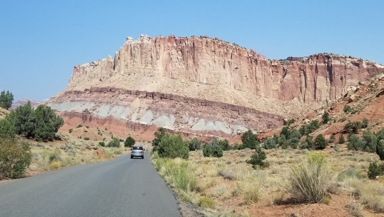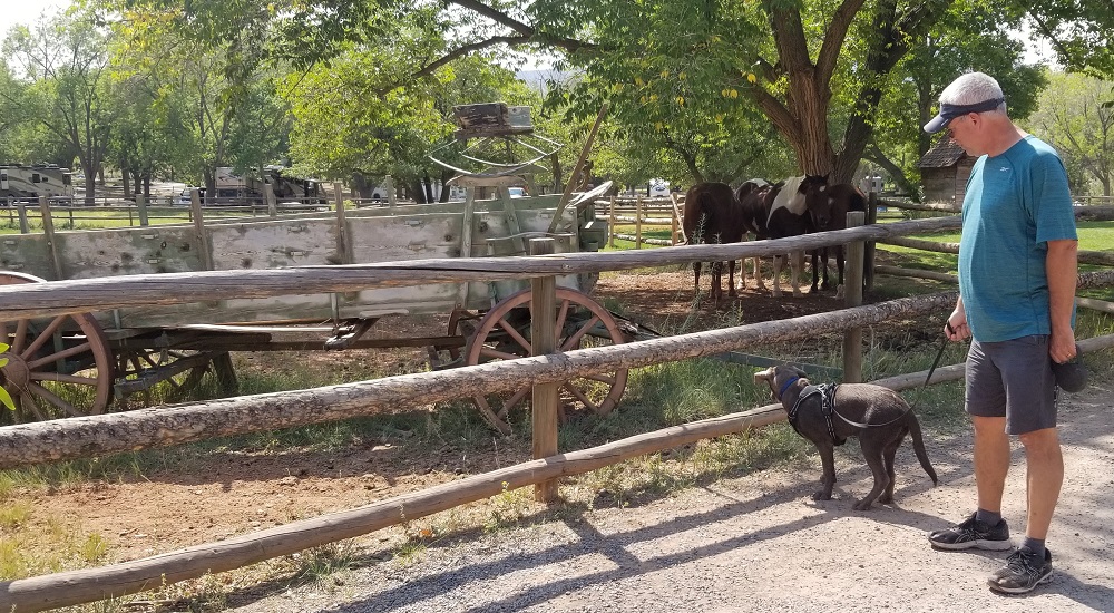 We were incorrect when we thought that the parks would be less crowded in the fall. Our thoughts were that students (kids and college) would be back in school…whether that meant virtually or in buildings… and that people are starting to return to work. What we didn’t expect was having trouble finding lodging. It’s fabulous to see all ages out and about but logistically it’s made it more difficult. We need to think more ahead and we have changed our roughed out itinerary to stay one night vs. two- and three-nights vs one at various places due to availability. When we walked the Camino de Santiago (three times, 500 miles on foot, a link to those adventures are also on our home page) we would walk into a town, look at a couple choices of places to stay, pick one and hunker down. On this trip we thought we would call ahead a day or two at the most to allow for flexibility but we are finding that fall is a high season where we are…Bryce and Zion coming up…and the hotels are full. Some NV hotels are booked through Oct 10th! Jackson, WY is $250/night at Motel 6! In most places, if there are vacancies, there are only a few hotels that accept dogs and only a select few rooms for dogs in each of those locations. Tonight, we are at what we would call a basic motel in Torrey, UT (population 240people at 6,837 vertical ft) just outside Capitol Reef NP. The room is small, has an exterior door (we like that), no fridge/coffee maker/micro (my bad, forgot to ask), vinyl flooring, shower no tub and equivalent to what we were paying last week ($70) for the same accommodations but with a fridge, coffee maker and microwave. This motel is $100/night incl the $15 dog fee. We planned on staying in Torrey two nights but we could not get the same room both nights so we are moving to Bryce ahead of schedule. But, I must add, the views are quite spectacular and the lodging choices in this small town are a select few. The reason for the shortage of lodging, according to a couple hotel owners is an increase in dogs traveling with their owners because there is a sharp increase in vehicle travel (vs flying). Leased vehicles (minivans, camper vans, larger campers you haul and driving large RV) are in abundance on the roads in addition to SUVs and 4x4s with roof campers.