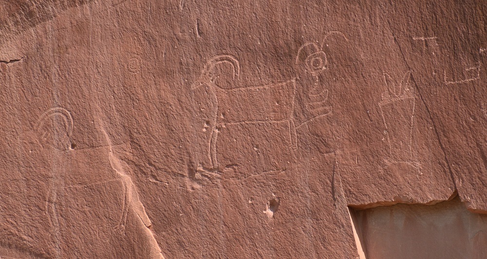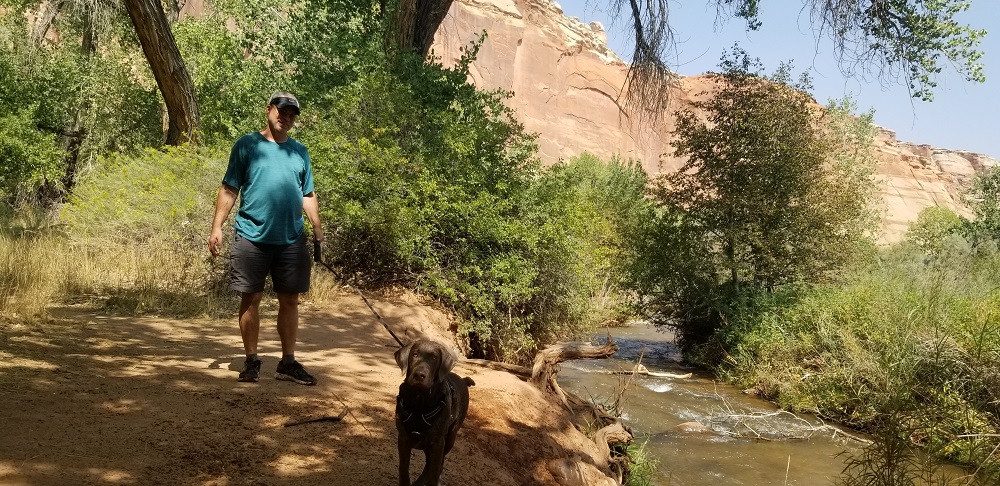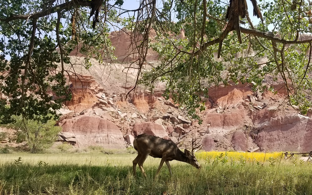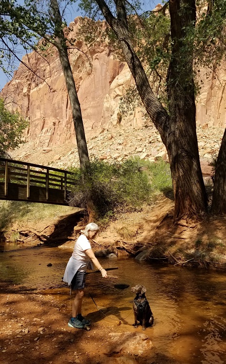 We entered the Fruita Historic District and the home to Capitol Reef National Park. I have read that the park is called Capitol Reef because early settlers thought the Navajo sandstone rounded hills resembled the top of the Washington DC capitol dome. There are turn offs to view some 1000 yr. old petroglyphs (see incredible close up photos Gary took), a 1912 built school house, 2000 cherry, apricot, peach, pear, apple, plum, mulberry, almond, and walnut trees in various orchards planted by Mormon settlers in Fruita, UT (fruit-a) in the 1880s. On the scenic drive in the park is the 1908 Gifford Homestead which is now a bakery with outstanding cinnamon rolls and homemade pies of which we bought 2! We got several wonderful pictures of Rangeley with the horses on the Gifford property and enjoyed a deer up close for quite some time. See video and pictures. We stopped at a great grassy picnic area across from the Gifford House. It has parking, tables, restrooms and access to the Fremont River which was low and perfect for a stick chasing pup! The large Cottonwood trees and huge red rocks reminded us of Sedona and Cottonwood, AZ. A Collette Tours bus has been following us through some of these parks. There are only 16 ppl on board but Wendy from Denver, the tour guide, was grateful for the group ranging from 20’s to over 80 yrs. old. She mentioned the tour company is steadily increasing their mainly outdoor tours with health precautions in place.