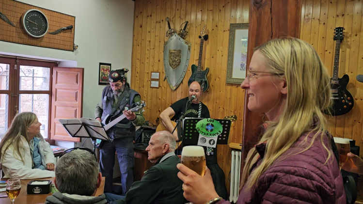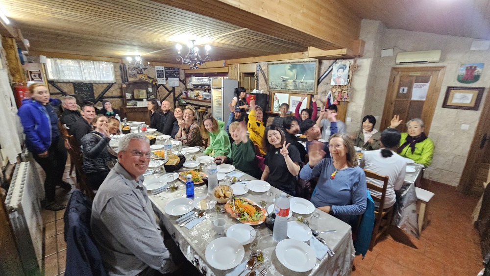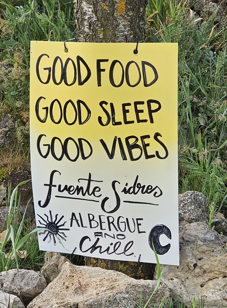 We stayed in Hornillos tonight. Enjoyed at short pilgrim mass at 6 and headed into a bar across the street from the church for a beer. Gotta love the spontaneous experiences that commonly occur on these Caminos! We heard an American love song so we entered the tiny bar. The guy behind the microphone playing an electric base guitar looked straight out of a biker bar! Rough exterior, leather attire, bandana covering his head, lots of facial hair. Just didn’t fit and made us laugh! After about 45 minutes of Spanish and American songs played, the lively small local crowd began to thin and the 11 of us remaining pilgrims shuffled into the quaint dining area. The food was fabulous! Again, the rustic, unassuming bar and the culinarily presented dishes served didn’t fit! It made our evening!!