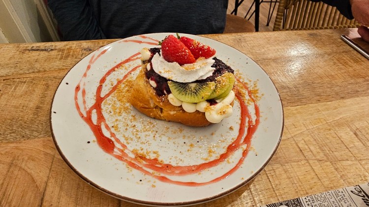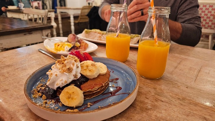 Gary’s Birthday breakfast was amazing! We went back to La Boveda in Burgos before heading out for the day’s walk westward toward Santiago. Check put the exotic and delectable waffles, pancakes and eggs Benedict we all consumed without hesitation! And, Gary got a brownie on the way out! Good thing we needed to knock out 13 miles today!