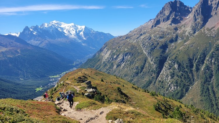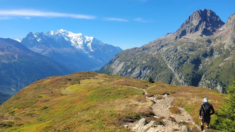 I had a long gradual climb after the quick start. The down started out slowly, then got very steep. At this point the TMB crowd was in full swing. It was difficult for me to go down, trying to be courteous, but I would wait for 10 people to go by, before getting a quick break. It was crazy. And it was like that for the entire 2,500’ drop. Just a steady stream of people going up.