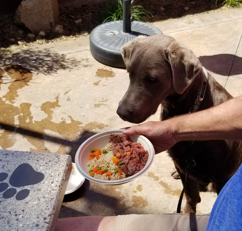 We met up with dear lifelong friends, in Orange, CA, at the Lazy Dog Restaurant. I mention it, not only because we had a fabulous time with them, but the restaurant has a “Dog Menu”! As my daughter-in-law said: “that’s progressive!”. We ordered raw hamburg, cooked rice and steamed veggies for Rangeley (he’s been on a raw DIY diet since 8 weeks of age). It was $5 and we can officially say that Rangeley has eaten out at a restaurant! Our meals were great too, the patio seating welcoming and fun was had by all. (see pics).