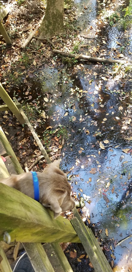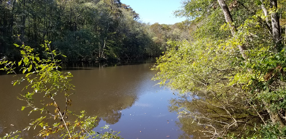 The park provides a flyer for a great self-guided tour of 20 educational stops explained in a paragraph or two at each interest station. It brings you to Weston Lake where I learned a new term, an oxbow lake. Weston Lake occurred 2000 years ago when the bend in the Congaree River gradually shifted, silt built up and eventually separated what is now Weston Lake. We watched fish jump, woodpeckers making music on the trees and blue winged butterflies flitting around in the 75 degree sunny day!