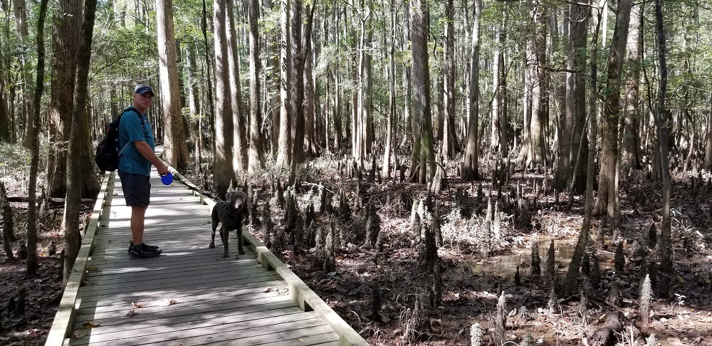 Gary, Rangeley and I thoroughly enjoyed our 2.4 mile round- trip walk on a magnificently built wooden boardwalk traversing across the wetlands, inside this fourth smallest national park on the mainland. Also, in the lower 48 mainland, Congaree has the second fewest visitors after North Cascades in Washington.