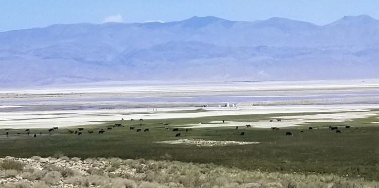 Owens Lake is owed by Los Angeles Department of Water and Power, California State Land Commission, California Department of Fish and Wildlife and some acreage is privately owned. As you can see from the photos we took and the one taken from the International Space Station, the lake is mostly marsh and salt flats. Portions of the water turn a brackish and red brown color due to the saline and mineral levels in the ground. I was intrigued by the lake’s varying colors and a variety of fence like partitions throughout the 17-mile-long, 10 miles maximum width and the mere 3-foot depth at its deepest section.