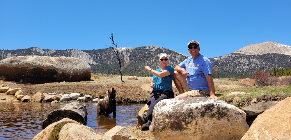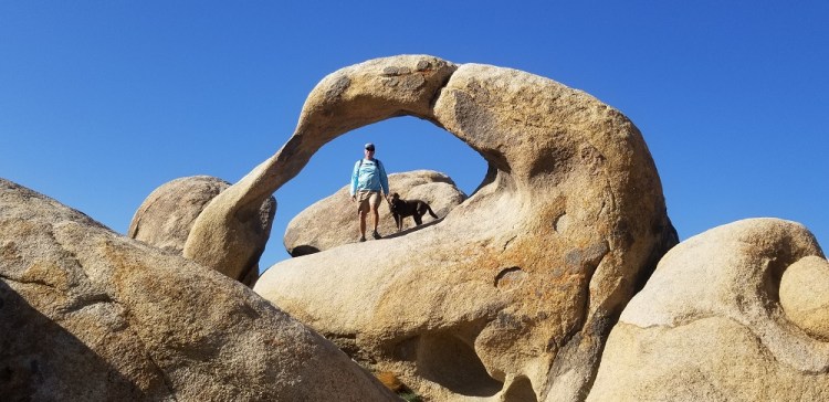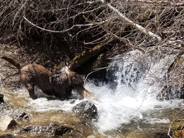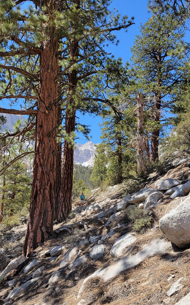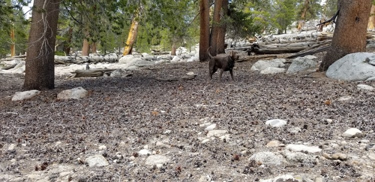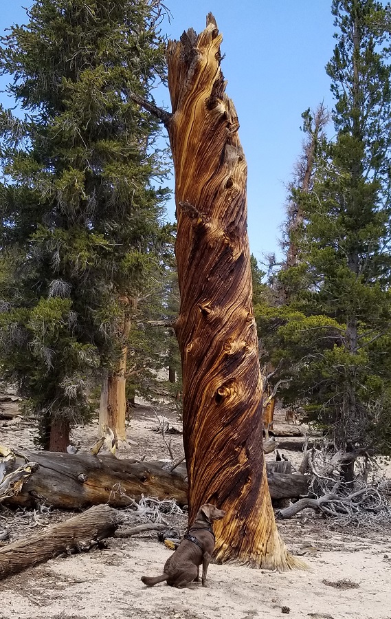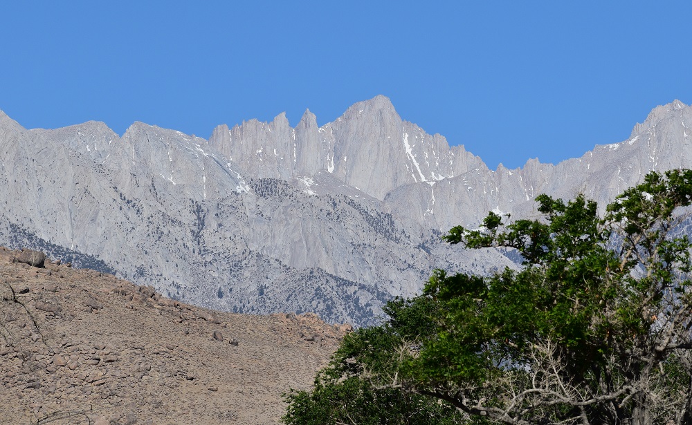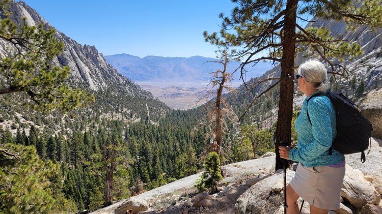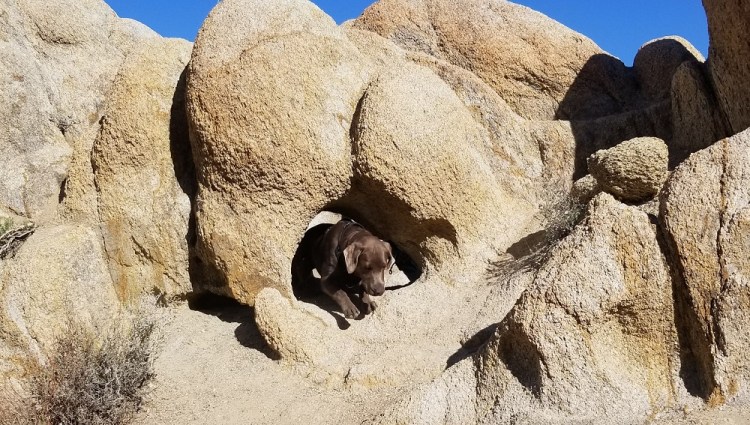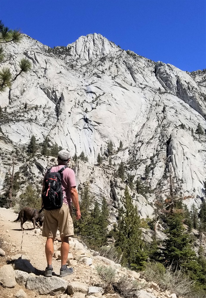 We then drove 14 miles up to the Whitney Portal. It was 78 degrees in Lone Pine at 3,700 feet and 52 degrees at 8,400 feet at the Portal. We hiked a mile plus up the Whitney Trail and had fun talking with day hikers, backpackers out for a night or two and some returning from conquering the Mountaineer’s Route to Whitney’s summit of 14,508 ft., the same route Gary has done twice. Rangeley loved the couple of streams we came across. Since I have never been to Mt. Whitney, I really enjoyed the hike as well as visually seeing where Gary’s climbing stories came from.