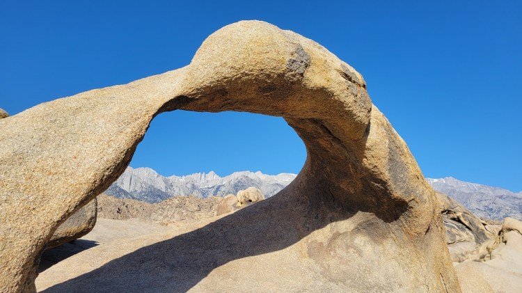 Our first walk in the wild this morning was in the Alabama Hills, 30,000 acres of public lands. 18,000+ acres of which was designated as a national scenic area in 2018. The Lone Pine residents, including those on the Lone Pine Reservation just outside the hills, and a conservancy organization have worked very had to protect and preserve this sacred and more recent, famous movie filming location. Beginning in 1920, over 400 movies have been filmed in the Alabama Hills, the surrounding area and in the town of Lone Pine. The name came from the Confederate warship C.S.S. Alabama. Civil War Confederate supporting prospectors were mining in the area and named the hills, the name was never changed. The strikingly different shape of these hills are made from wind erosion and natural chemical changes due to weather.