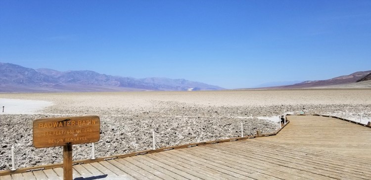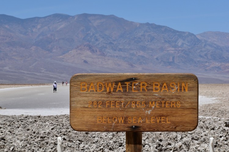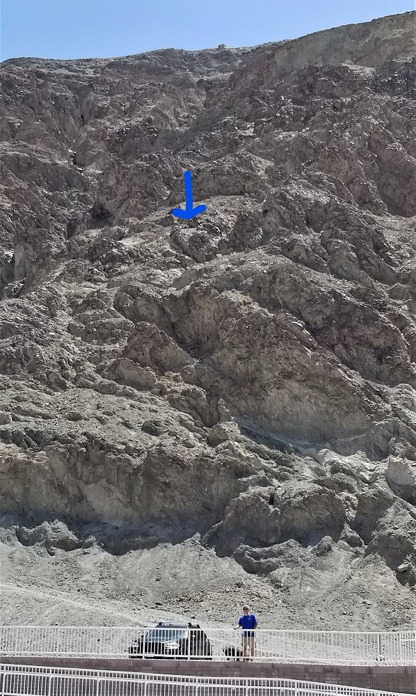 Badwater Basin is the lowest, hottest and driest location in North America! It was 97 degrees at noon while we were there. The intermittent and sprawling salt flats for as far as the eyes could see rests 282 feet below sea level. See picture to illustrate on a cliff just how much 282 feet is. We would be deep in the ocean if the basin filled with water!