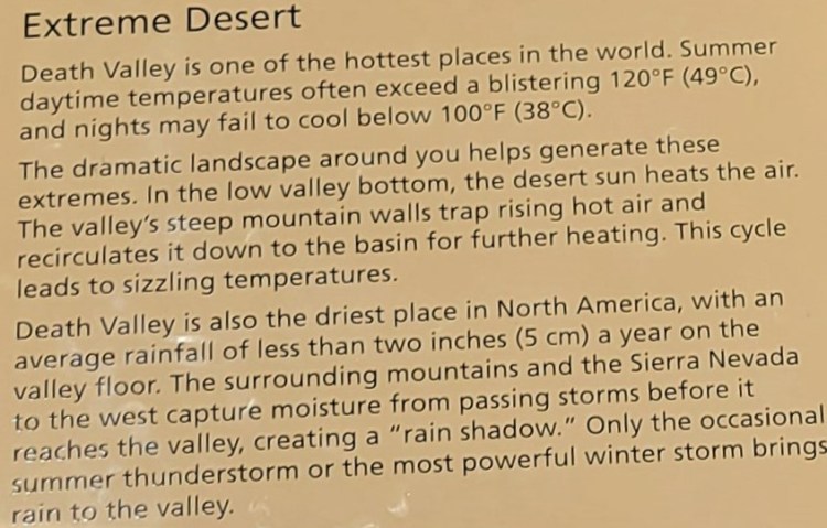 From Wikipedia – Death Valley is the hottest, lowest, and driest place in the United States, with daytime temperatures that have exceeded 130 °F (54 °C). The park protects Badwater Basin and its vast salt flats located at the lowest elevation in North America, −282 ft (−86 m). The park also protects canyons, badlands, sand dunes, mountain ranges, historic mines, springs, and more than 1000 species of plants which grow in this geologic graben.