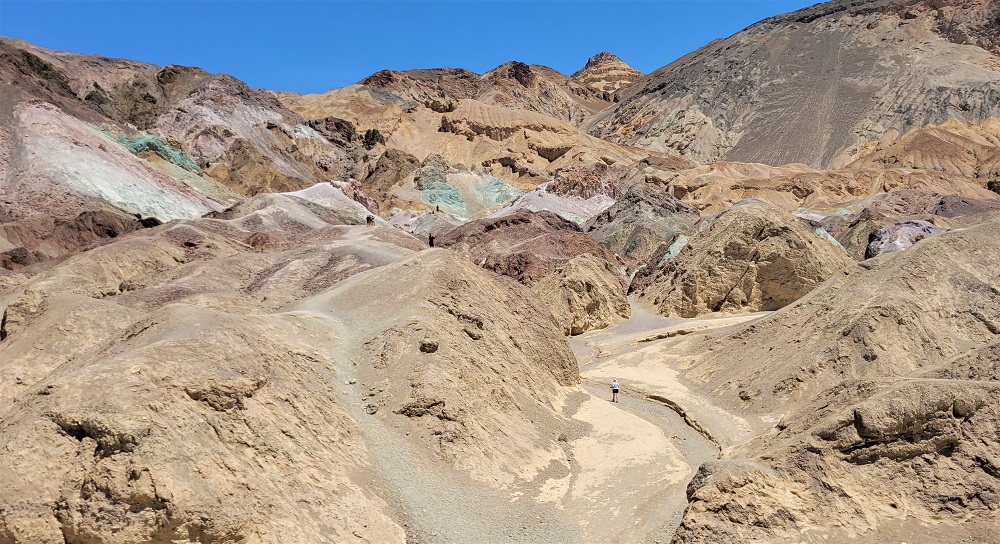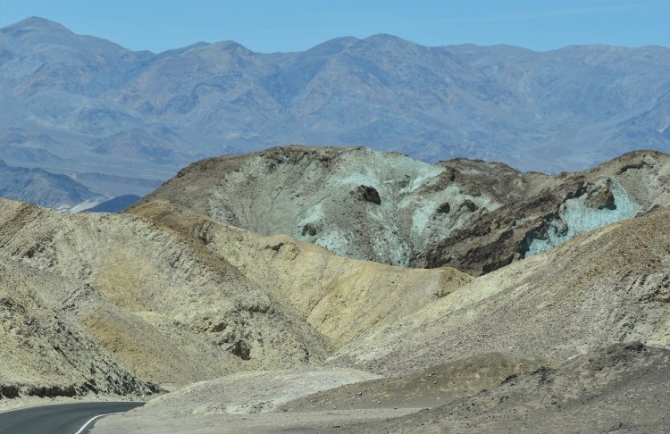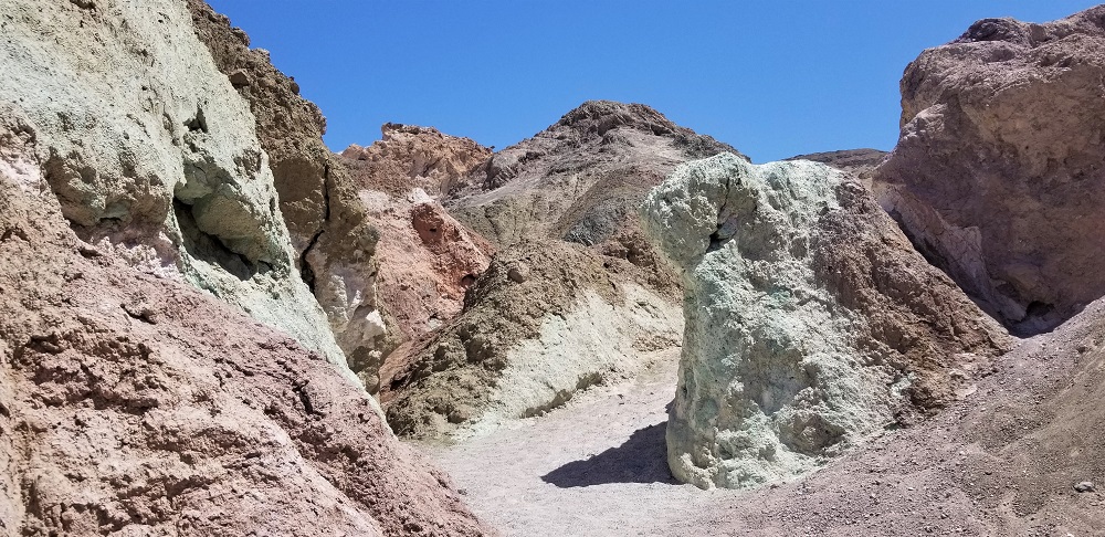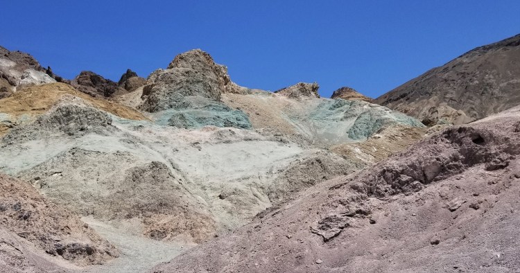 My favorite visual location in Death Valley was taking the 9-mile Artist’s Drive Scenic Loop to Artist’s Palette about halfway. I enjoyed a walk amongst the many colors left by volcanic mountains full of iron oxides and chlorite. Enjoy the pictures of Death Valley’s fireworks displays of teal, red, violet, orange and more.
