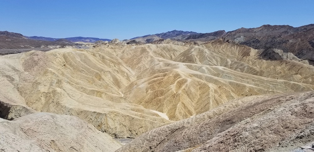 Zabriskie Point was our last stop in our last park of this trip. It was a “not to miss” show of what seismic vibrations, wind, rain and erosion can do to mountains!