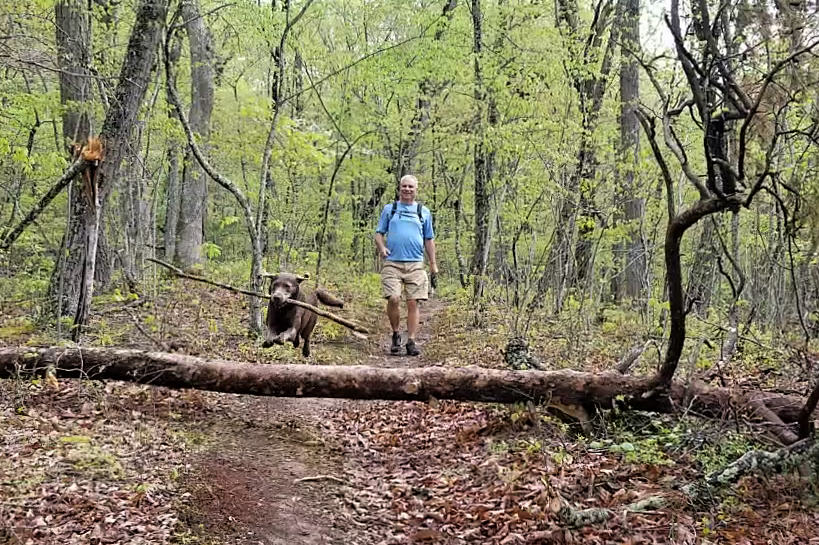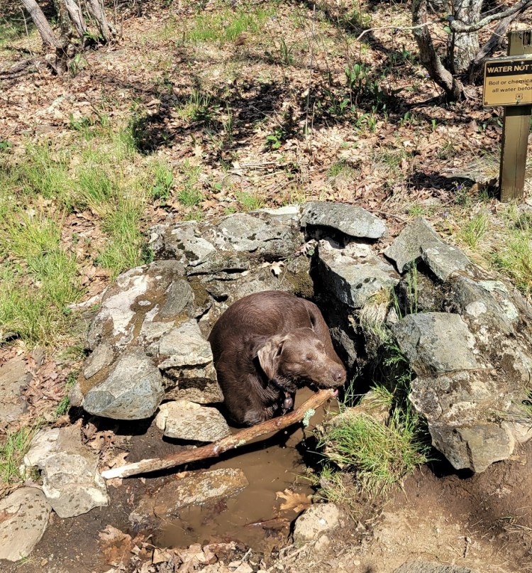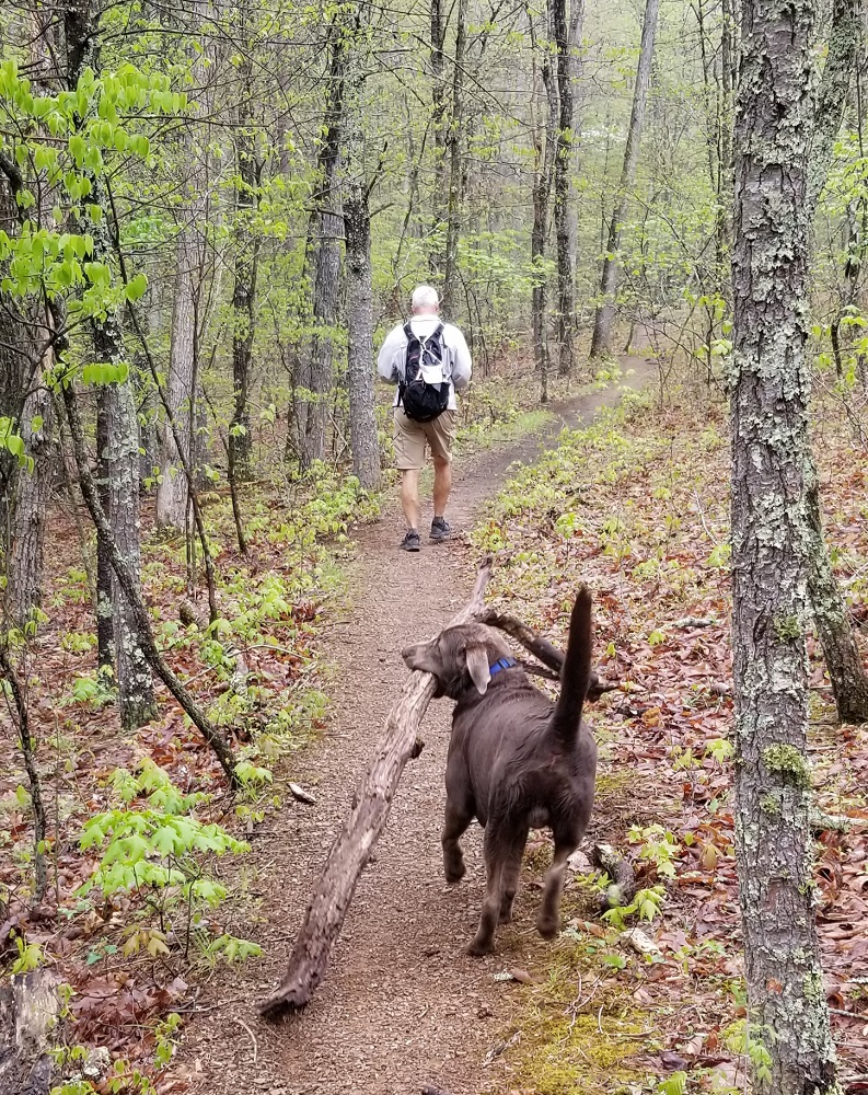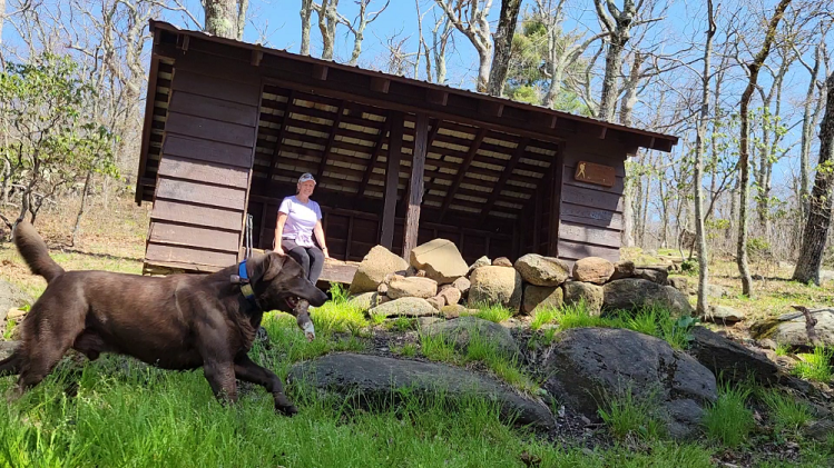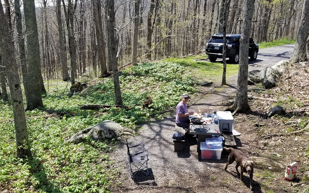 We still had a few cold drinks and hot dogs in the cooler so we set up in a semi remote parking lot just off the Skyline Drive and next to the AT. Three women, two section hikers doing about 100 miles and a thru hiker sat for over an hour with us enjoying the Trail Magic while Rangeley scoured the woods for sticks to play with.