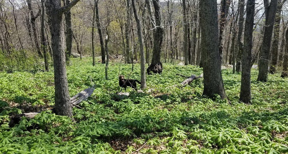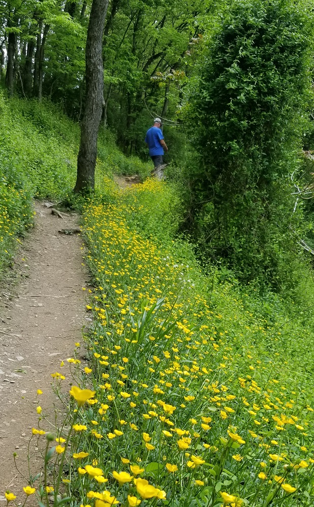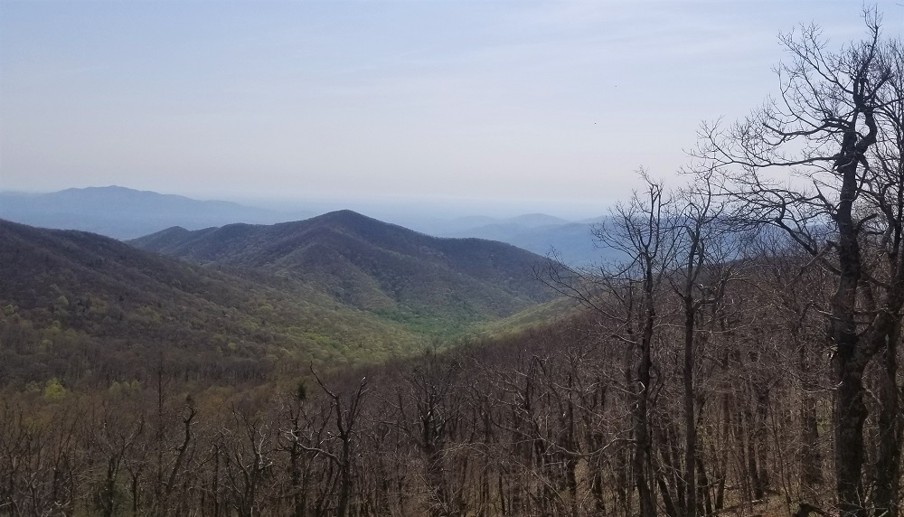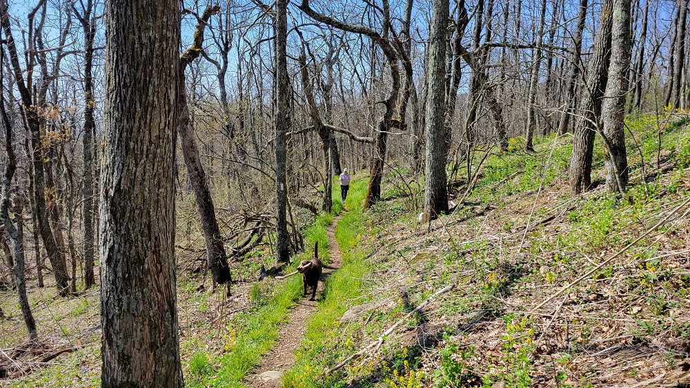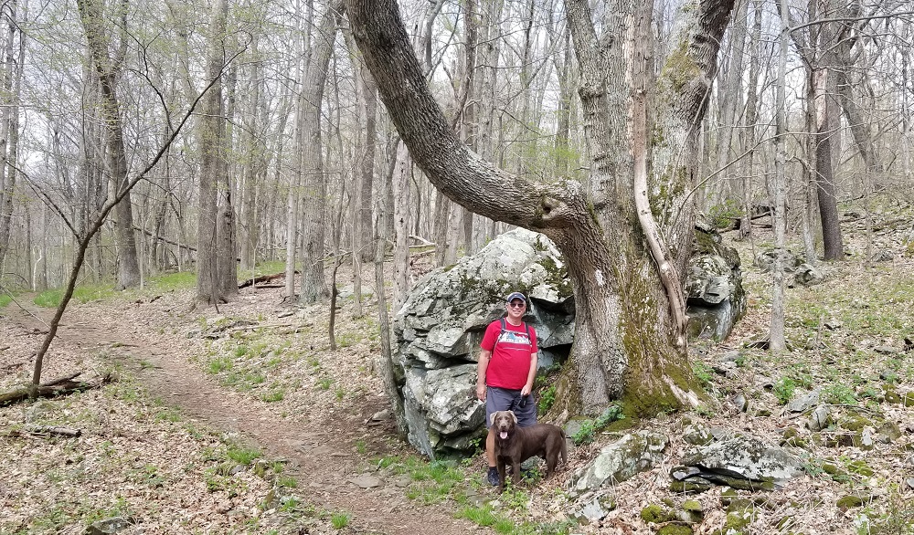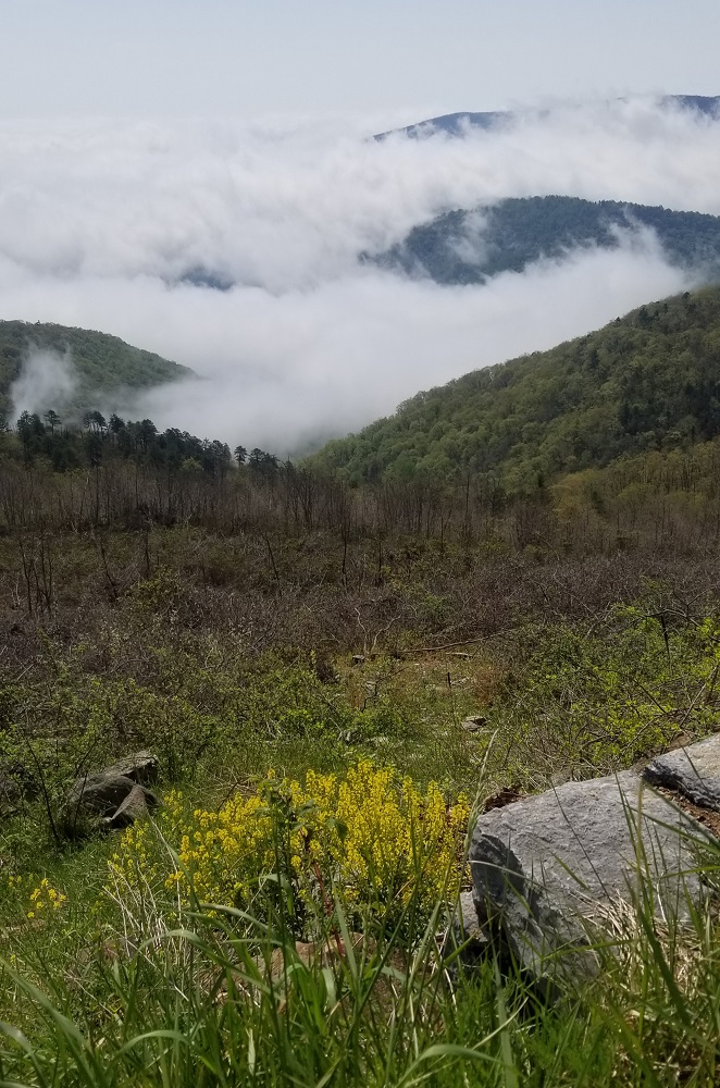 We drove through Shenandoah National Park on Skyline Drive – 3,680’ at its highest point that you can drive to. Just north of the Blue Ridge Parkway. Another gorgeous drive…when the skies are clear. This morning we were socked in with fog. Just before the Park’s entrance we pulled into a parking lot. Within moments, there were four very appreciative thru hikers enjoying our left-over snacks and cold drinks from yesterday’s Trail Magic! And, as we have experienced on numerous occasions, we met others traveling around the USA. A German couple were patiently awaiting the fog to lift before they too enjoyed Skyline Drive. Rangeley – on lead due to the closeness of a main road -was happy to greet each person as they gathered. A New Yorker popped out of her car, smiling, stating she was apologetically eves dropping on our conversations. We welcomed her and offered to have her join our party of smiling strangers all with the same goal…to soon experience a day of sunshine, great views and appreciation for the American land set aside for all in the world to enjoy.