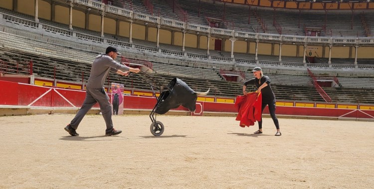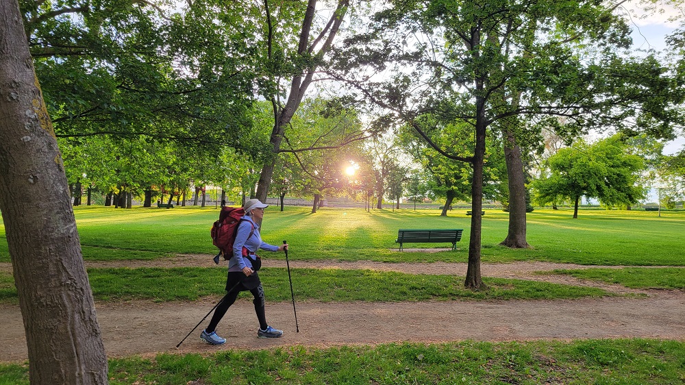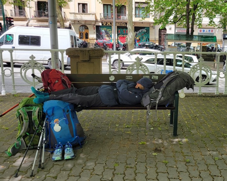 Walking into Pamplona today we took the route along the river vs. walking in town (the traditional Camino route) which is on sidewalks, beside city traffic. We stopped at the Plaza de Toros, the famous bull ring. Gary and I did a self-guided tour last year. Gary, Cooper and Chelsea toured it today. No bulls or matadors active at the time but the bullfighting is still legal in Spain. Pamplona is the location of the well-known Running of the Bulls in July of each year with the Corrida/”bull fighting” occurring March through October. Regardless of anyone’s feeling re: the practice, the tradition of this “sport” is strong in local history. I did not go into the arena this time, opting to be the keeper of the mochilas/backpacks. I enjoyed a much needed and appreciated nap, with my feet up, on a park bench, under two trees, just outside the arena.