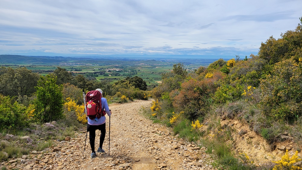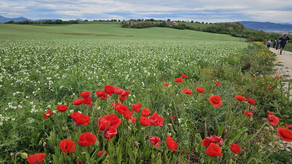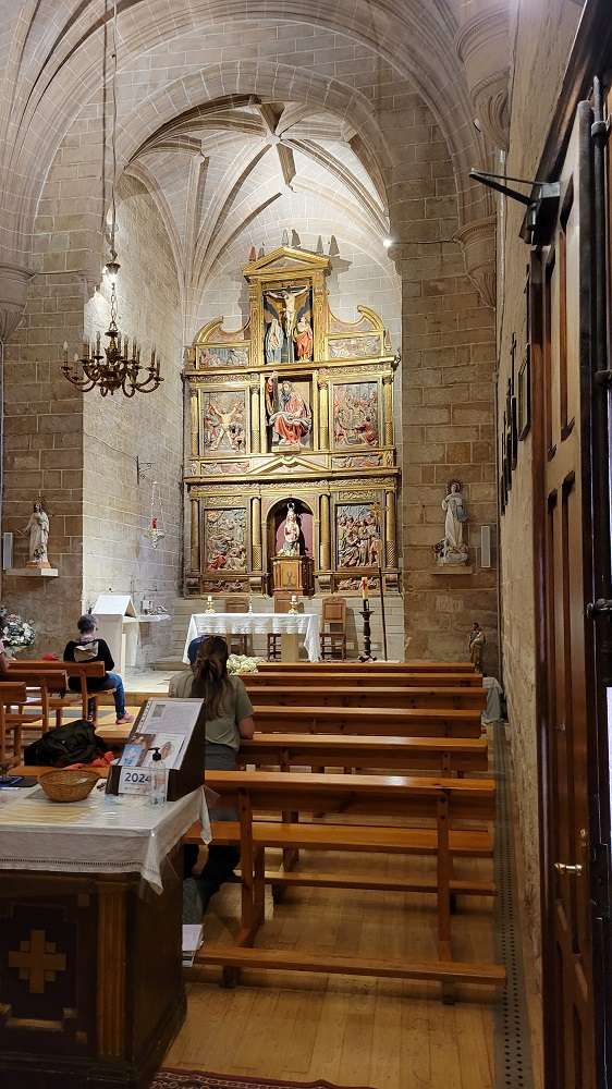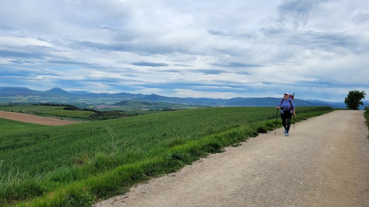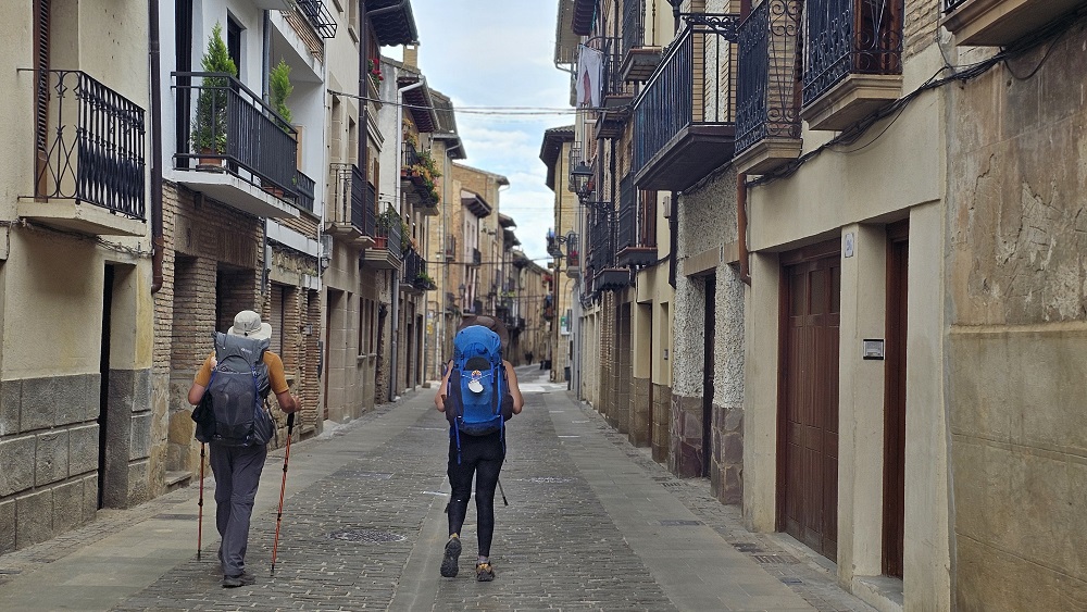 The weather has been all over the place. It’s cool in the mornings, can be windy or cloudy and then today the sun came out and it was warm and 70 degrees. A friend of ours commented on our blog asking how we dry out our shoes from the mud, snow (early on) or rain. The first night we had a wood stove in our room so we gathered the kid’s backpacks and sneakers and placed them in our toasty habitacion. The other way to dry out your shoes is to remove the inserts and place newspaper inside the shoe. It doesn’t always work. Gary and I carry a second pair of inserts and always have dry socks with us so even if the shoe is wet, changing out the inserts and socks for dry ones helps. Luckily, northern Spain will be dry and warm as we continue. Now, as I write this, it’s been lightning and raining at 7pm. One of my home state of Vermont’s sayings…If you don’t like the weather, just wait a minute! As I finish this sentence, the rain hesitates, sky clears a bit and out our bedroom window tonight is of large storks flying past the 1500s church steeple across the road here in Puente La Reina – The Queen’s Bridge – pop. 2,800ish. The 11th century queen had the bridge built for the Pilgrims to cross the Rio Arga, the same bridge we will traverse on our way out of town tomorrow morning!