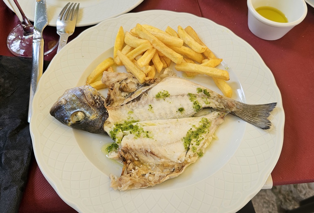 I had a rough day with really sore leg muscles and my knee swelled up again. Nothing new during my first few days on these Caminos, past and present. Today’s walk took me a long time. Gary offered, on two occasions throughout the day, to carry my pack but I was stubborn and refused. But about 1/2 mile from our day’s final destination, two South African guys came up to me. One took my pack…he didn’t take my “no thank you” answer when he asked to carry it for me. The other walked my snail’s pace the rest of the way beside me. Gary, Cooper and Chelsea had previously forged ahead to get the rooms. We later met these two guys – who made my first ” The Camino Provides” experience a wonderful one – at a restaurant patio for dinner and drinks. Gary had planned for us to celebrate at this very simple market/restaurant patio for our 38th anniversary. The wine, a simple antipasto, ensalada mixta (green salad), baked chicken, risotto and a tortilla, along with the company made for a memorable evening. Good thing we had a fridge at Casa Tao where we were staying for some leftovers!