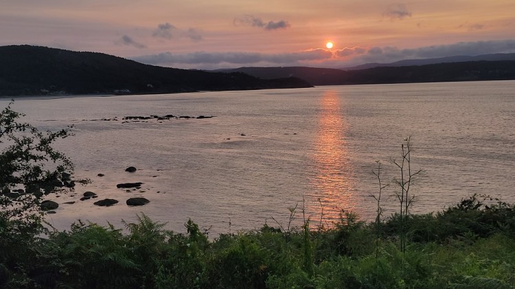 G: After getting the room switch taken care of, Elizabeth was content to read her book. I asked if she had any interest in climbing to the high point of the peninsula (el 783’). Her answer – no! So I headed out on my own, walking across to the beach we went to yesterday and then just followed any trail that went up. There are a few trails that crisscross the hill. It was a great climb, quite steep at one point, with amazing views back over the Atlantic. Once on top there were 360 degree views and being on a narrow peninsula it was mostly of water. I thought about heading back down toward town but decided to continue along the ridge and come down by the lighthouse at the southern end of the peninsula and follow the road down from there.