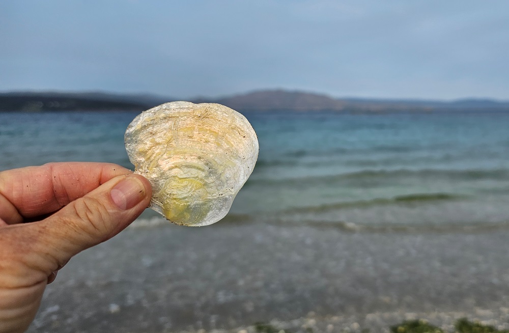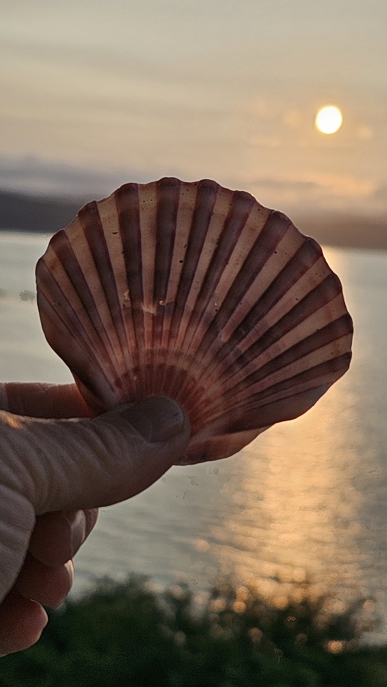 E: After early to bed last night, we naturally awakened at 6AM ready to walk the beach and enjoy the sunrise. We were hoping to find Camino shells, oyster shells, as the tide was low. Lots of shells but no “Camino shells”.