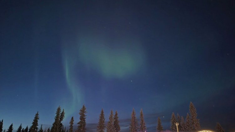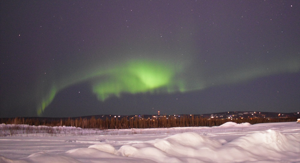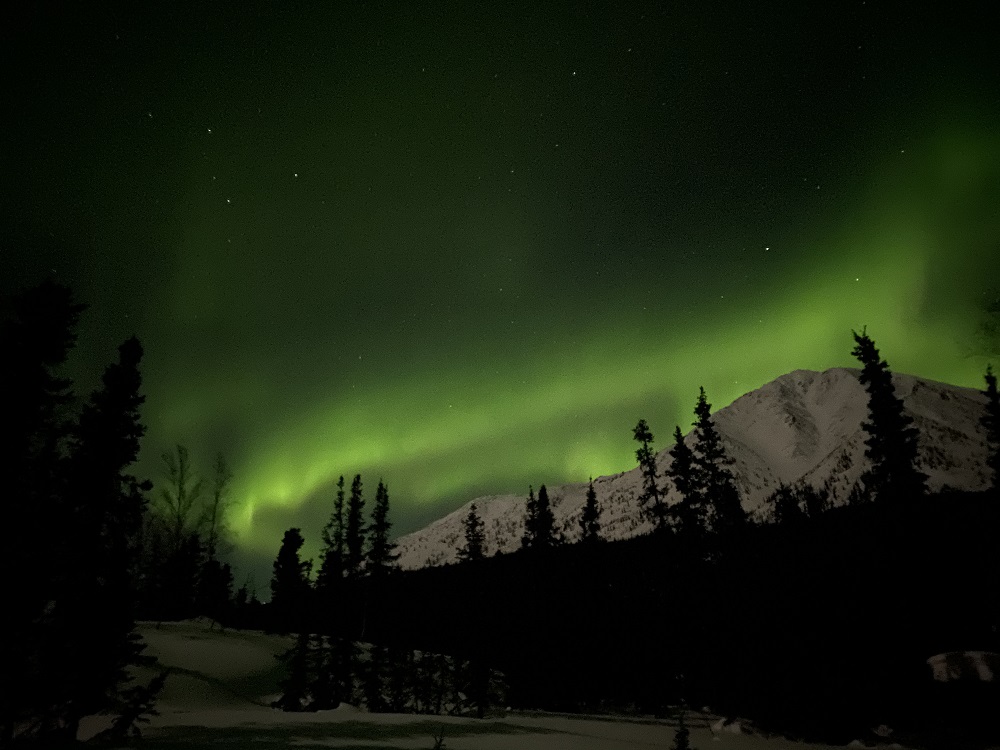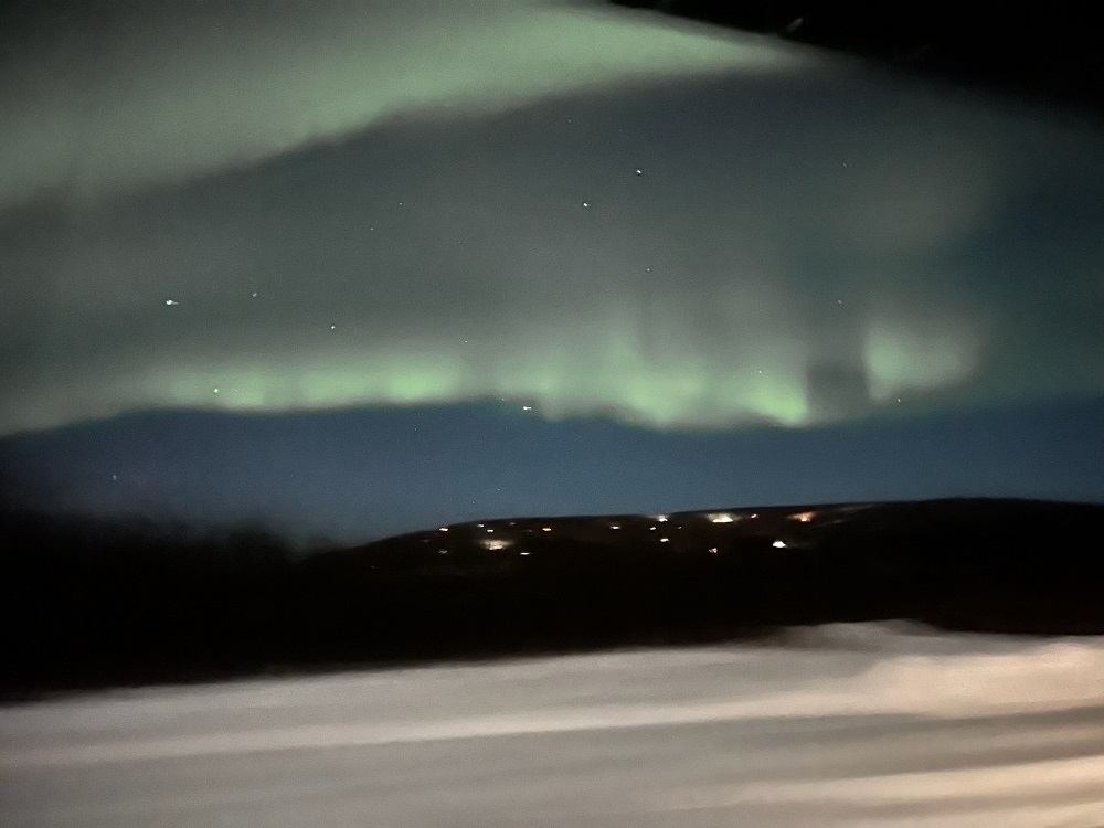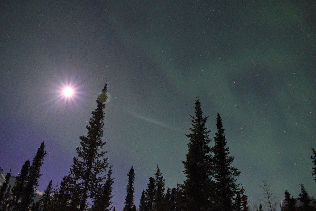 Our spring ahead Daylight Savings Day began at 3:30 AM, yup AM. John awakened us all, at our request, if he saw the Northern Lights behind the lodge. We all dressed ourselves in the fur lined hooded Arctic jackets and subzero boots they provide, slid on our bibbed snow pants, neck warmers, hats and serious down mittens, grabbed our phones, cameras and tripods and headed out in the 20 below weather…yup, I said 20 degrees below zero. Aurora began her show. See pictures below.