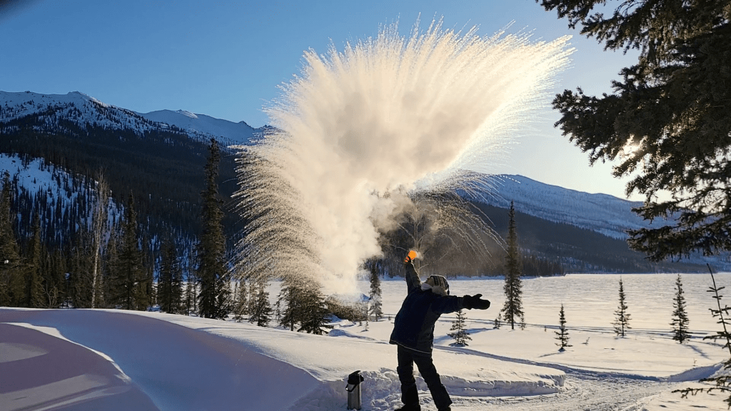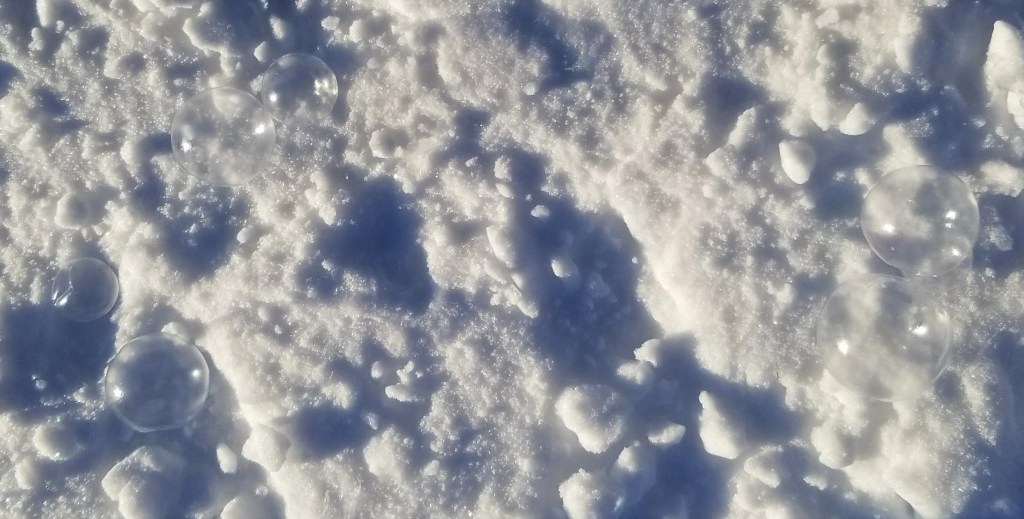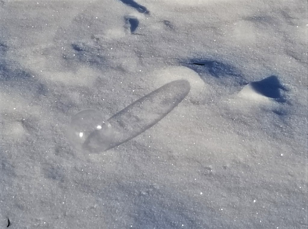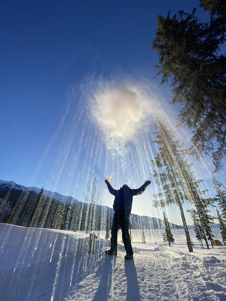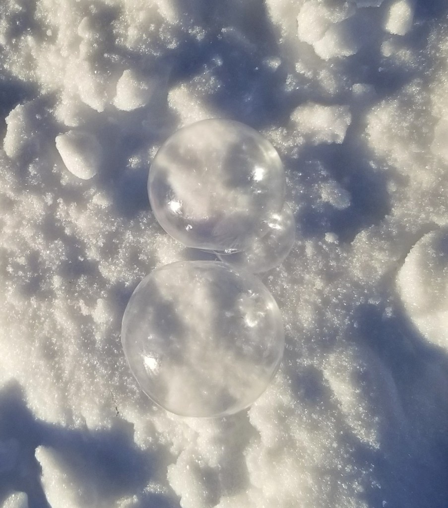 After returning to bed, we were slowly awakened around 8AM (sunrise was about 8:30) with the lovely smell of coffee brewing. Breakfast was served shortly thereafter. But the best fun we’ve had in a long time was the simplistic and spectacular “child’s play” after breakfast. We filled large soap bubble wands and watched the magic of blowing bubbles in now 30 degrees below zero weather. The bubbles harden as soon as you blow it through the wand, floating slowly, soon to shatter into feather-like pieces floating in the air. Some bubbles settled on the 3-foot-deep snow, teetering on the surface, moving slowly in the wind until it too shatters. Then, the magnificent photo ops began. John brought a thermos full of hot water and a large plastic cup out to us. We filled the cup with the hot water, tossed it overhead, into the air, and watched it freeze instantly creating shimmering ice crystals in the morning sun and snowy powder showering down in the shape of an umbrella. Enjoy the pictures! We loved the experience!