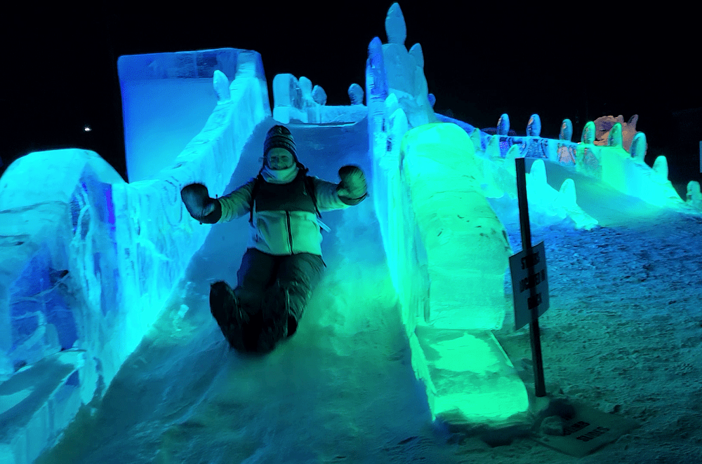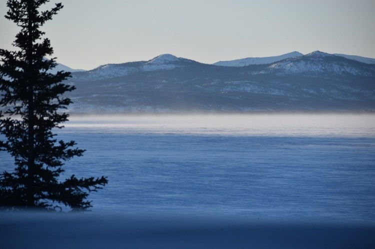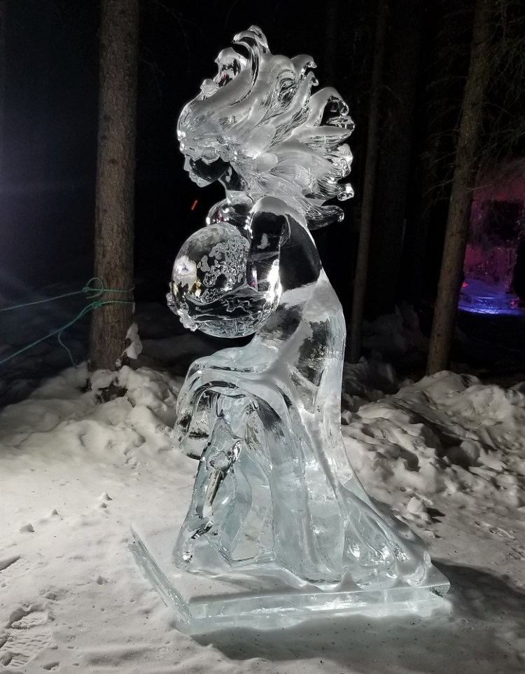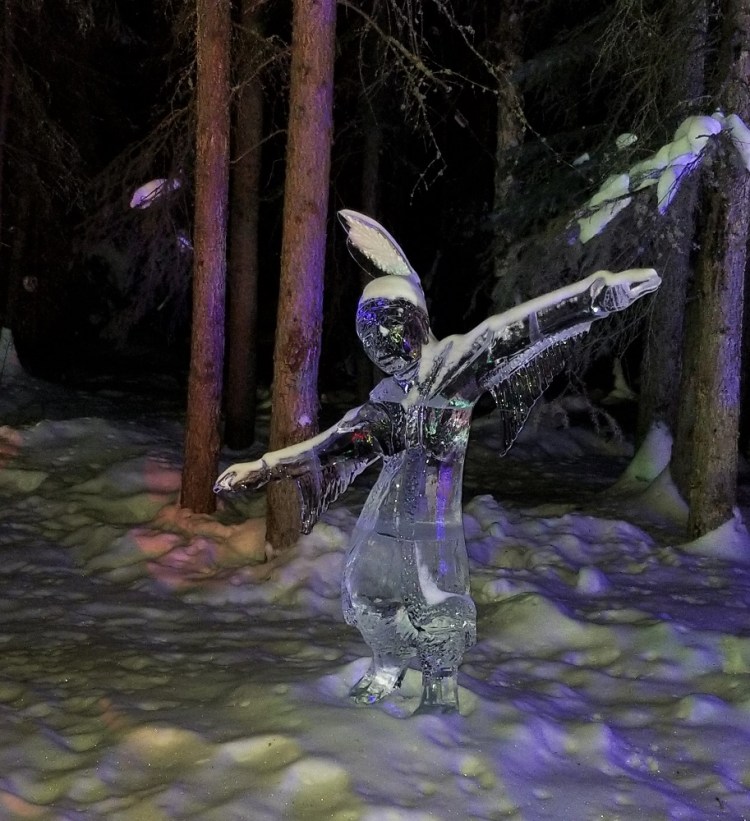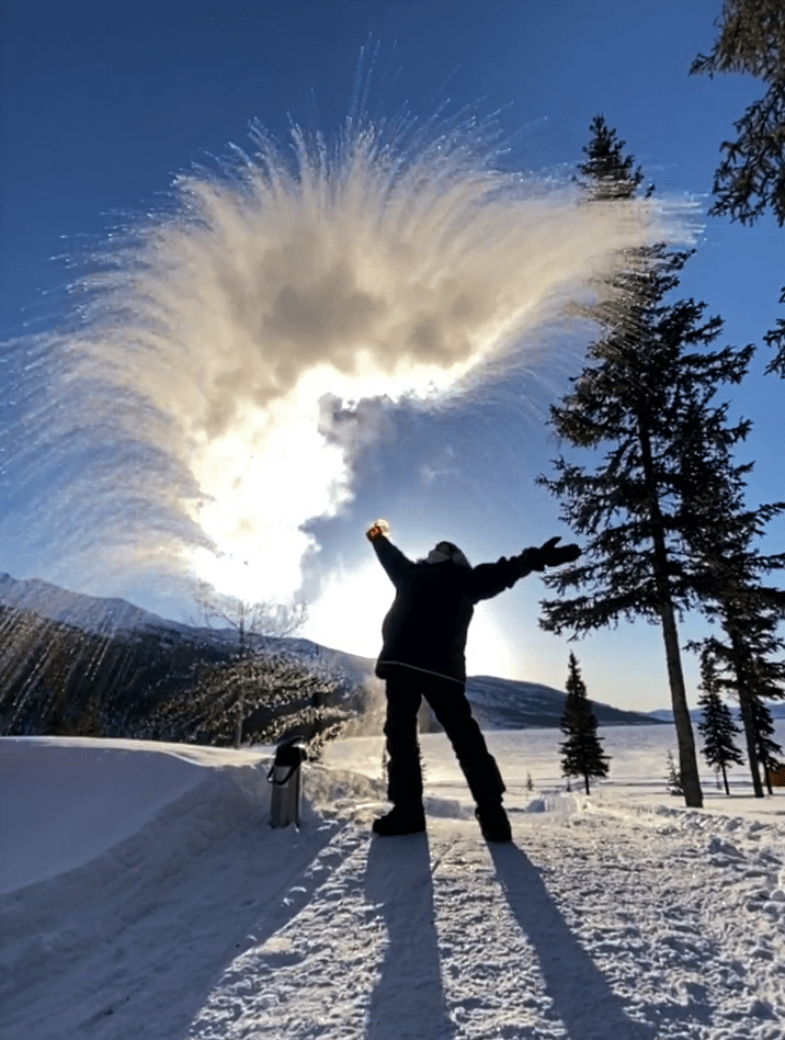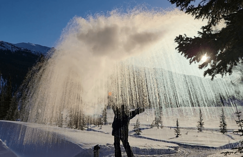 After returning to bed, we were slowly awakened around 8AM (sunrise was about 8:30) with the lovely smell of coffee brewing. Breakfast was served shortly thereafter. But the best fun we’ve had in a long time was the simplistic and spectacular “child’s play” after breakfast. We filled large soap bubble wands and watched the magic of blowing bubbles in now 30 degrees below zero weather. The bubbles harden as soon as you blow it through the wand, floating slowly, soon to shatter into feather-like pieces floating in the air. Some bubbles settled on the 3-foot-deep snow, teetering on the surface, moving slowly in the wind until it too shatters. Then, the magnificent photo ops began. John brought a thermos full of hot water and a large plastic cup out to us. We filled the cup with the hot water, tossed it overhead, into the air, and watched it freeze instantly creating shimmering ice crystals in the morning sun and snowy powder showering down in the shape of an umbrella. Enjoy the pictures! We loved the experience!
