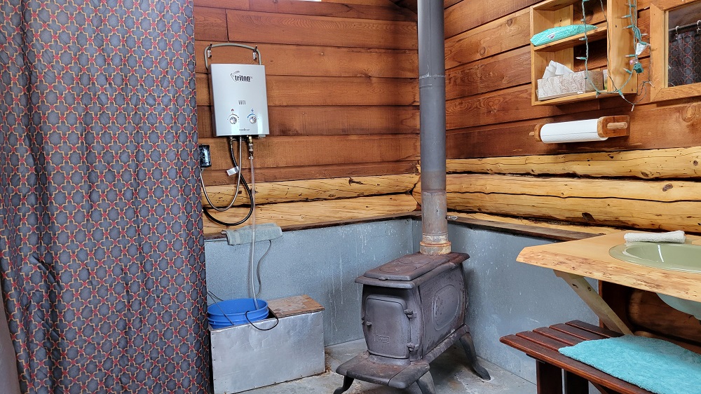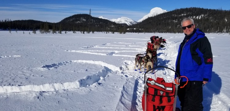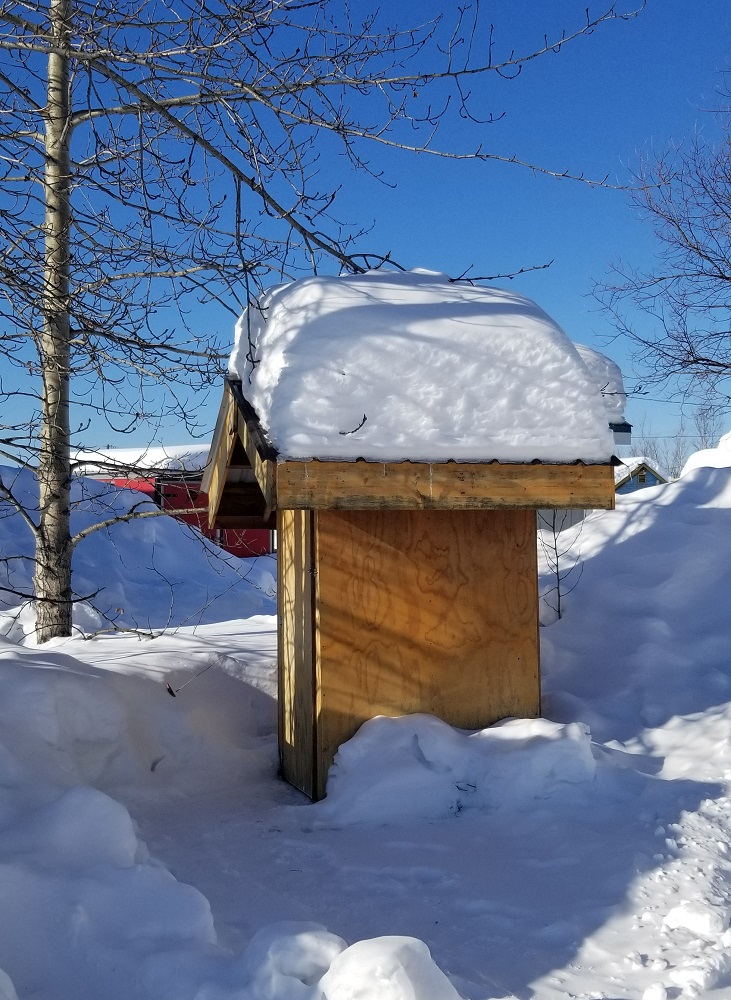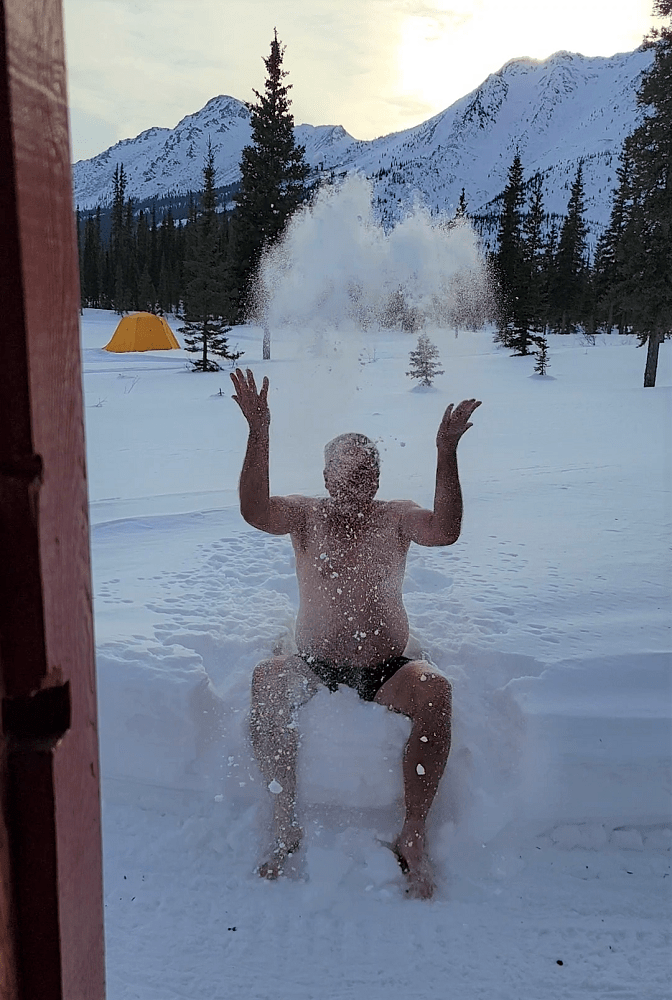 Gary and I then set off to the shower house that had been warmed up by a wood stove earlier in the day. Sherry and Craig used it before we got back. They chose to snow shoe and wander the lodge’s grounds and the frozen lake, in solitude, while we were all out mushing. Before showering in the 84-degree wood burning stove bath house, Gary jumped into the snow with just his boxers on! The shower’s hot water is heated by propane located outside, behind the hut – with a hot water bottle recently placed on its valves to keep it from freezing! We enjoyed the now sauna like hut, put clean clothes on and walked back to the main house for dinner.